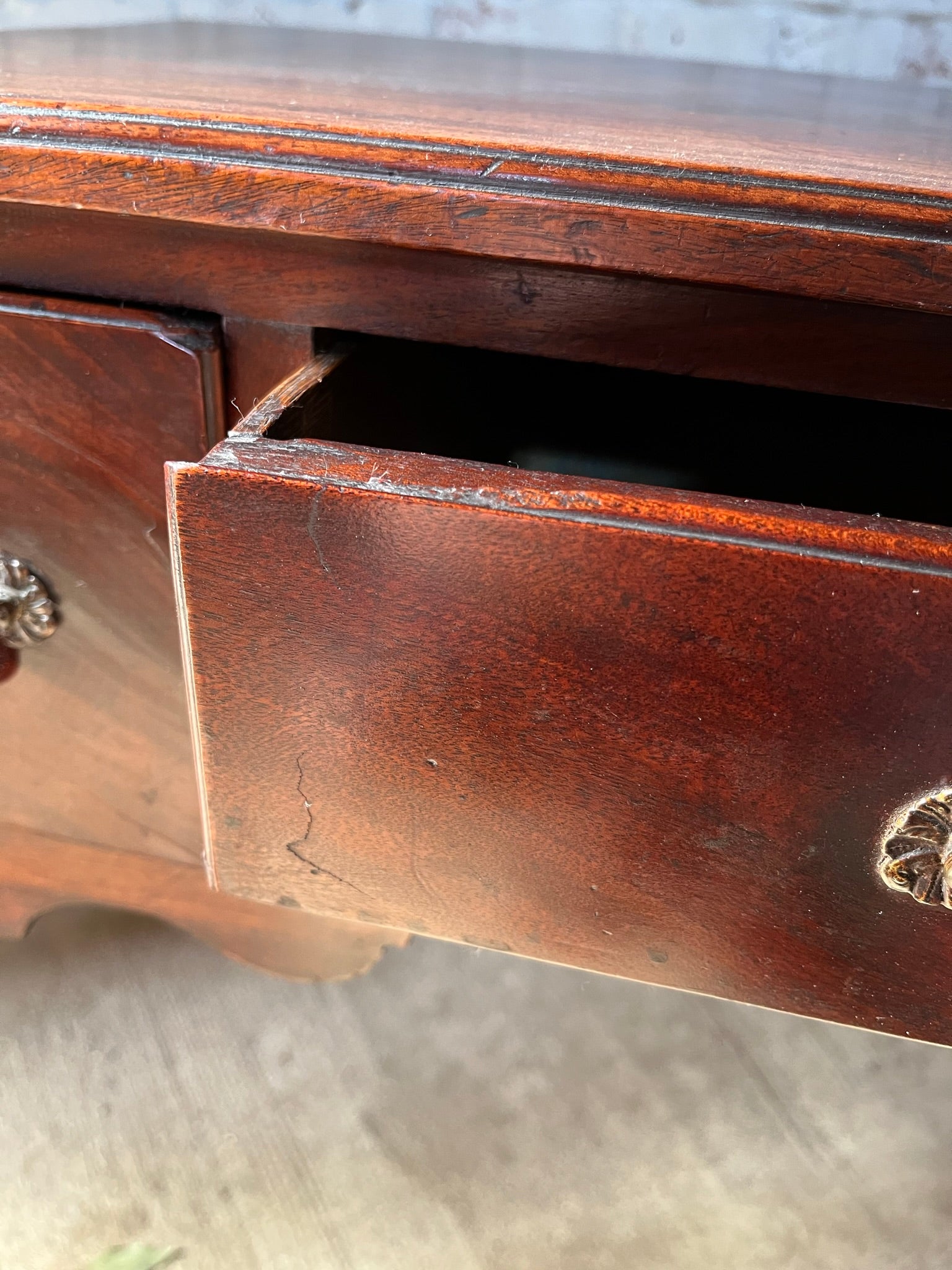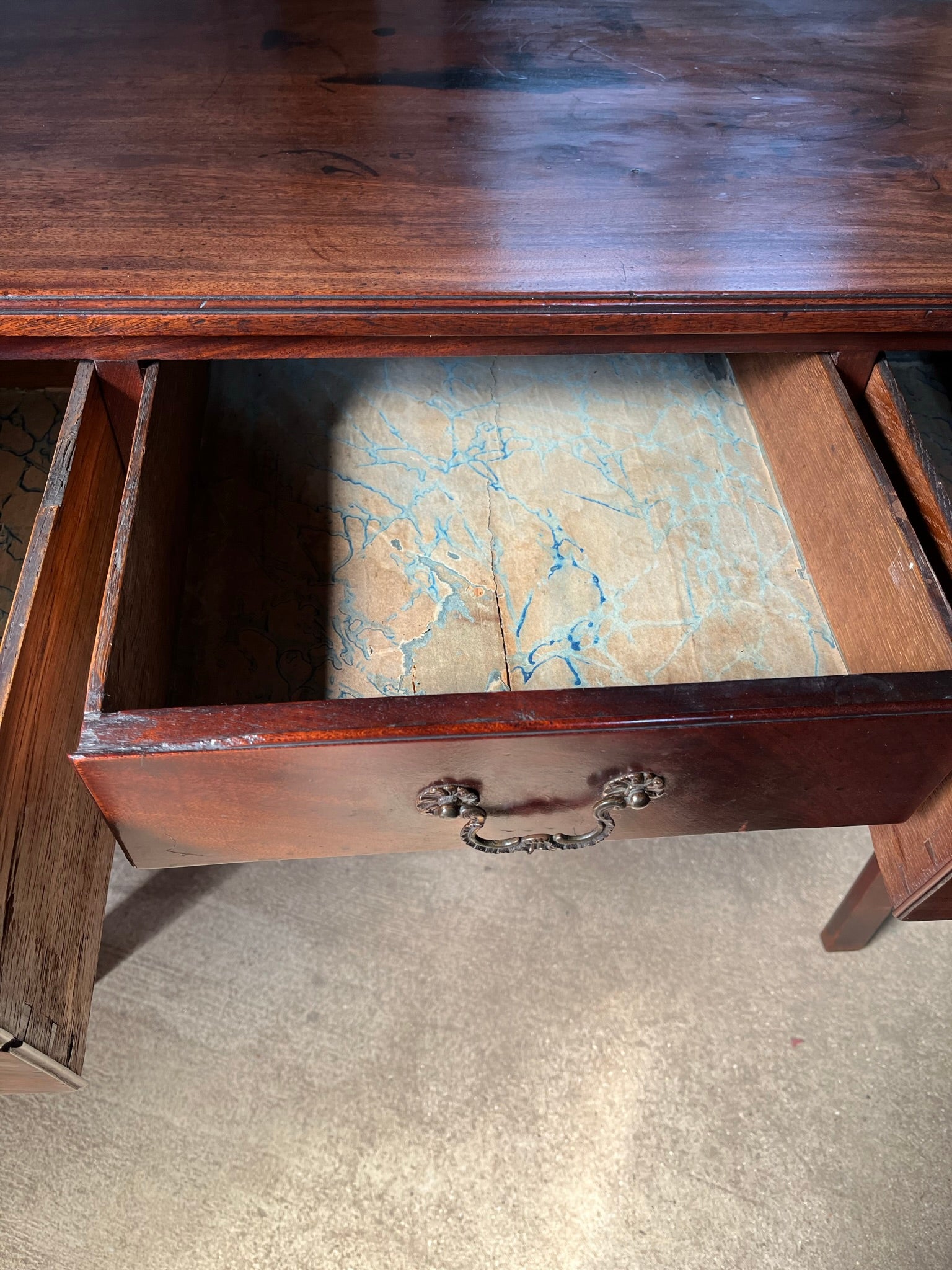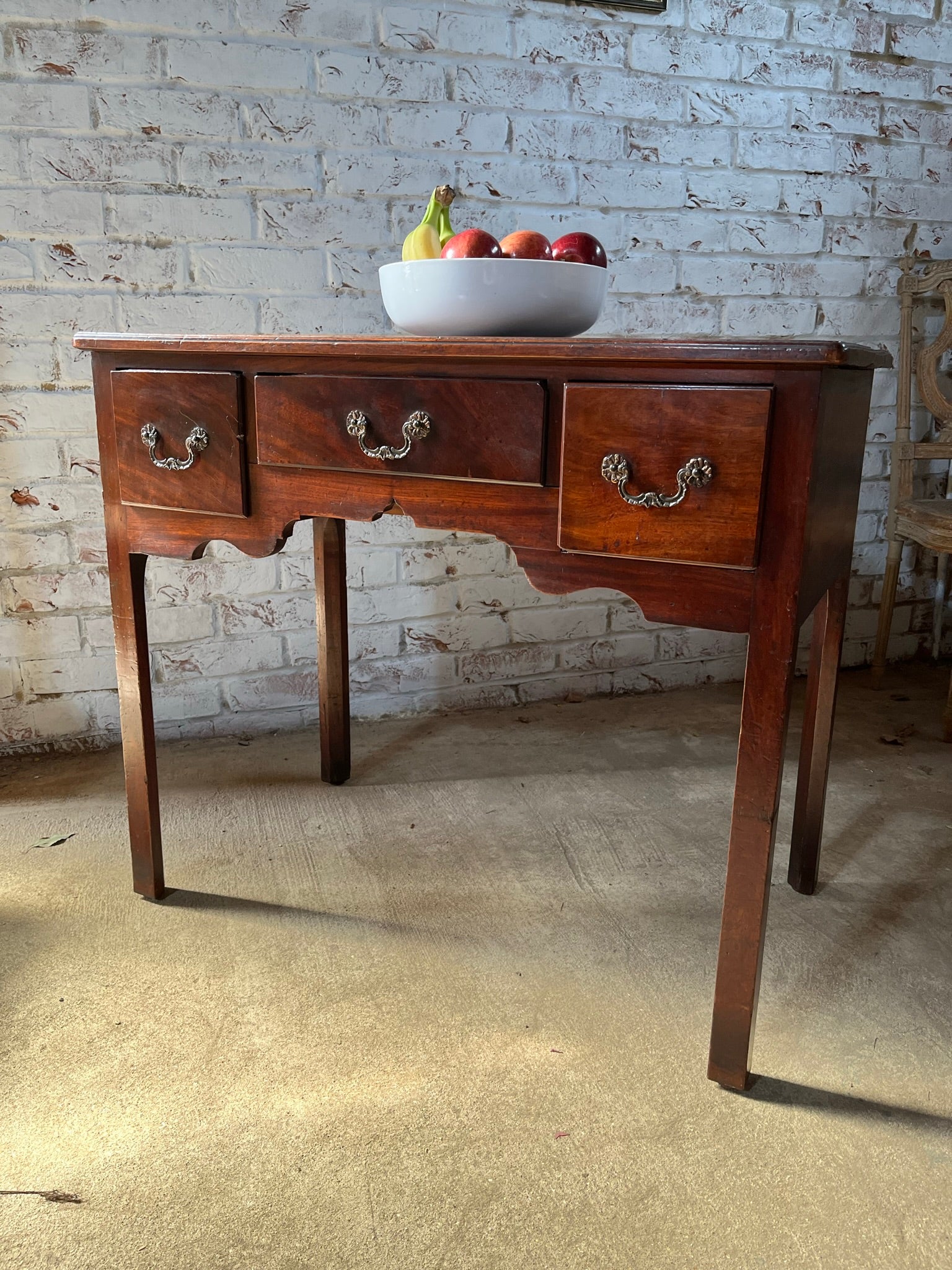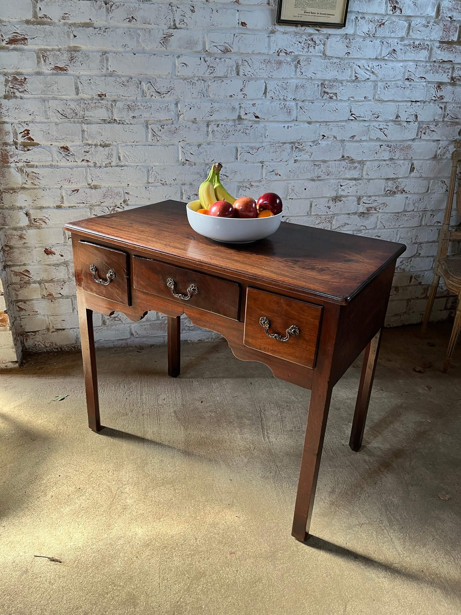 A pretty18th-century Georgian mahogany lowboy, with channeled sides and front edge of the top, above three drawers and classic canted square legs, with the remains of marble-effect paper drawer linings.