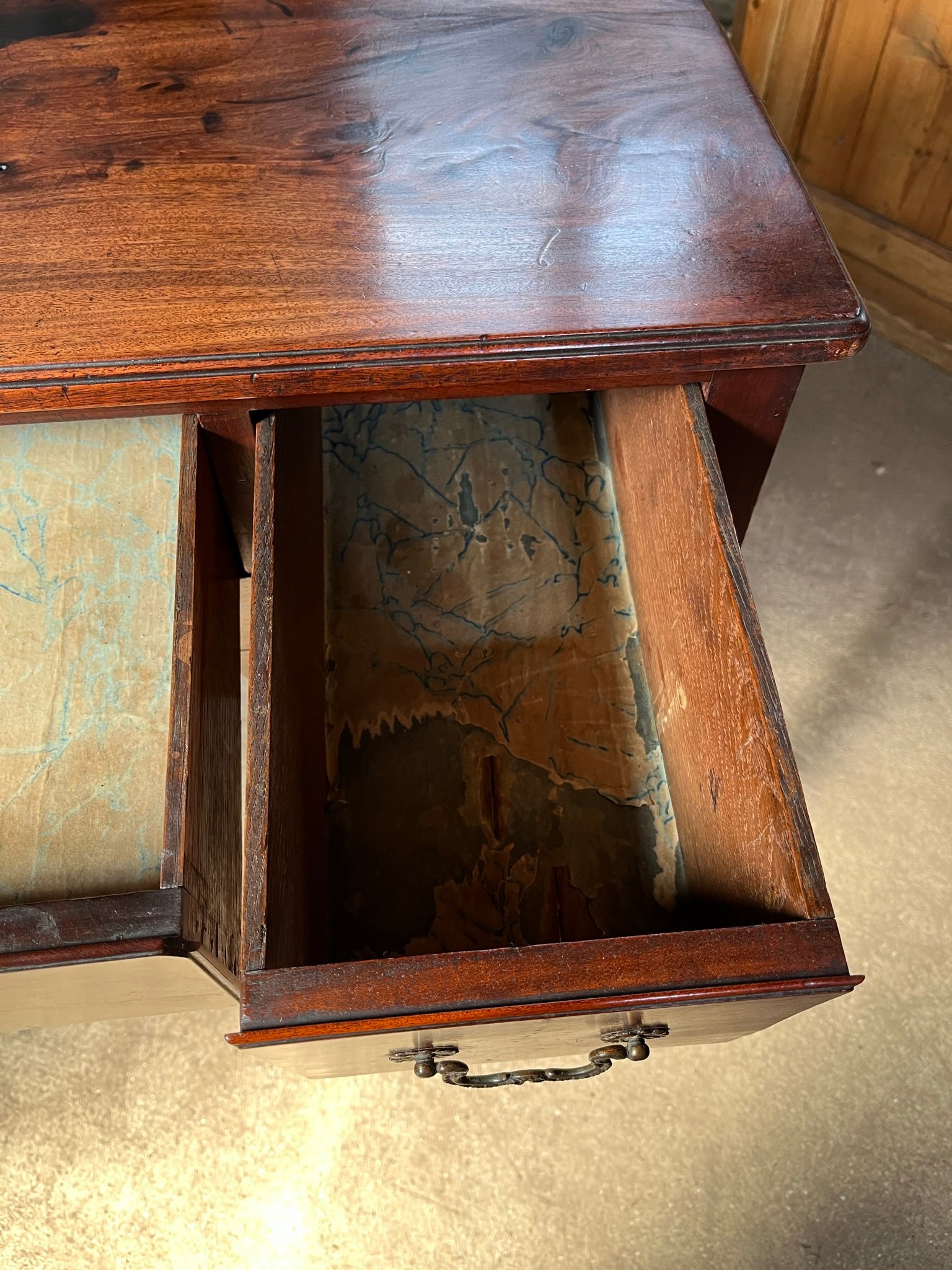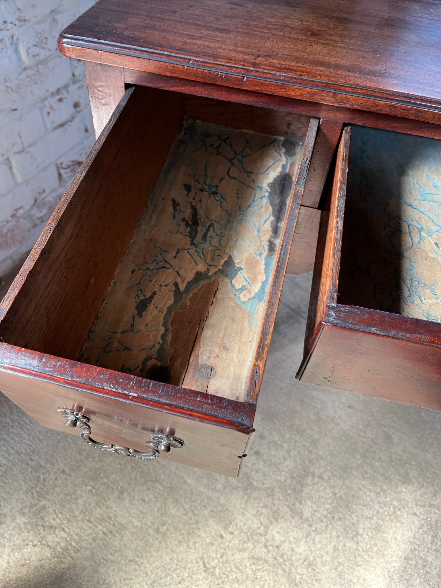 Full of character, with attractively figured grain, rich color and deep patina. The expected wear and tear - including old ink stains, dings and scratches to the top, very slight losses to the drawer edges which I purposefully haven't restored - please zoom in on photos for details. (At some point metal discs have been added to the bottom ends of the legs to protect them, which I've left in, but just let me know if you want them removed before delivery.)
