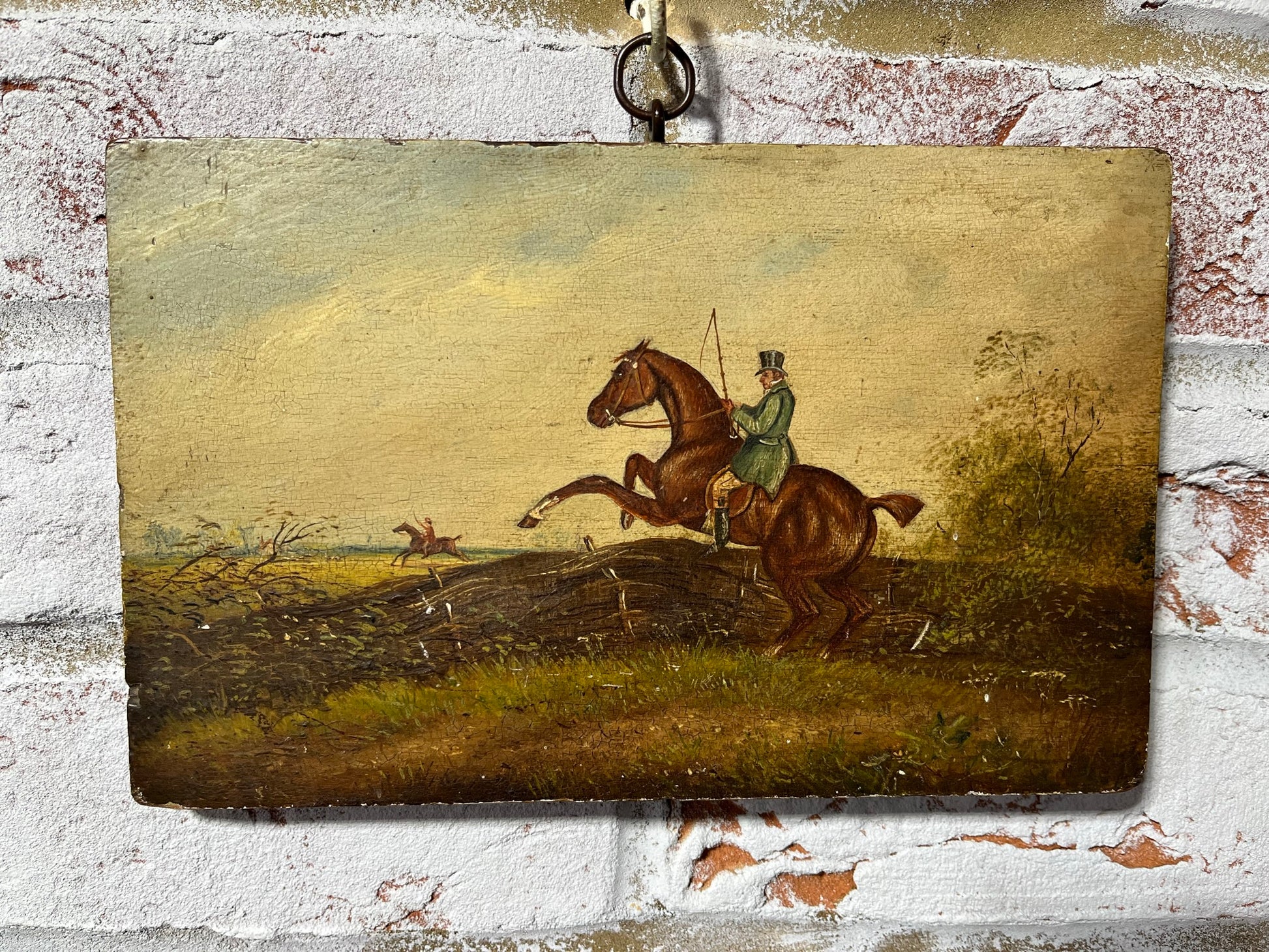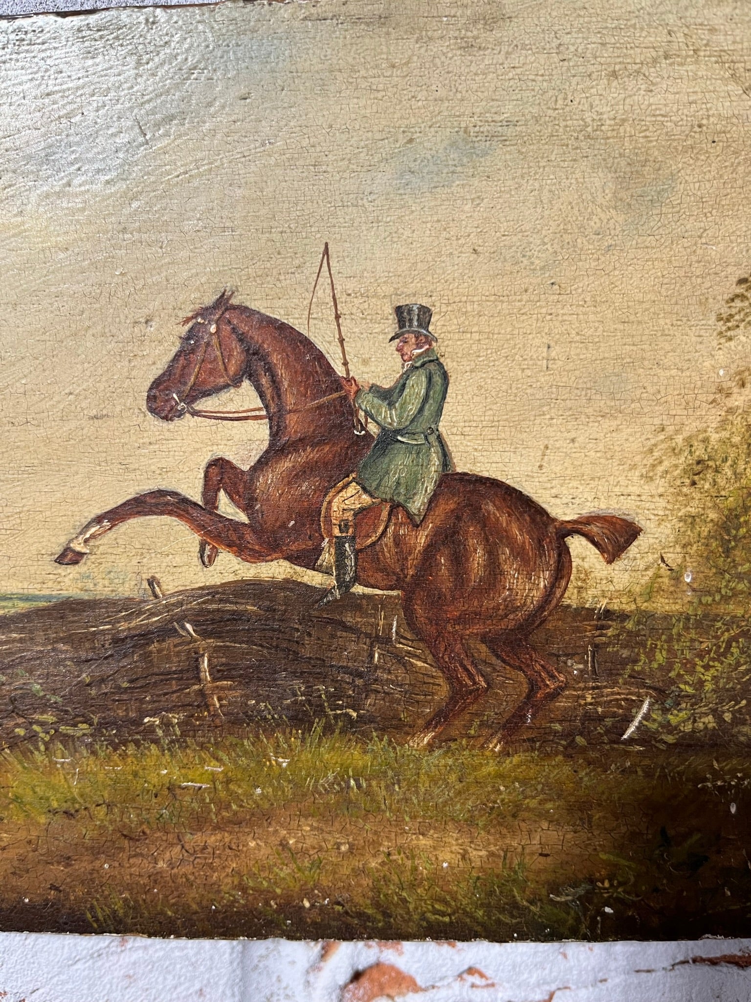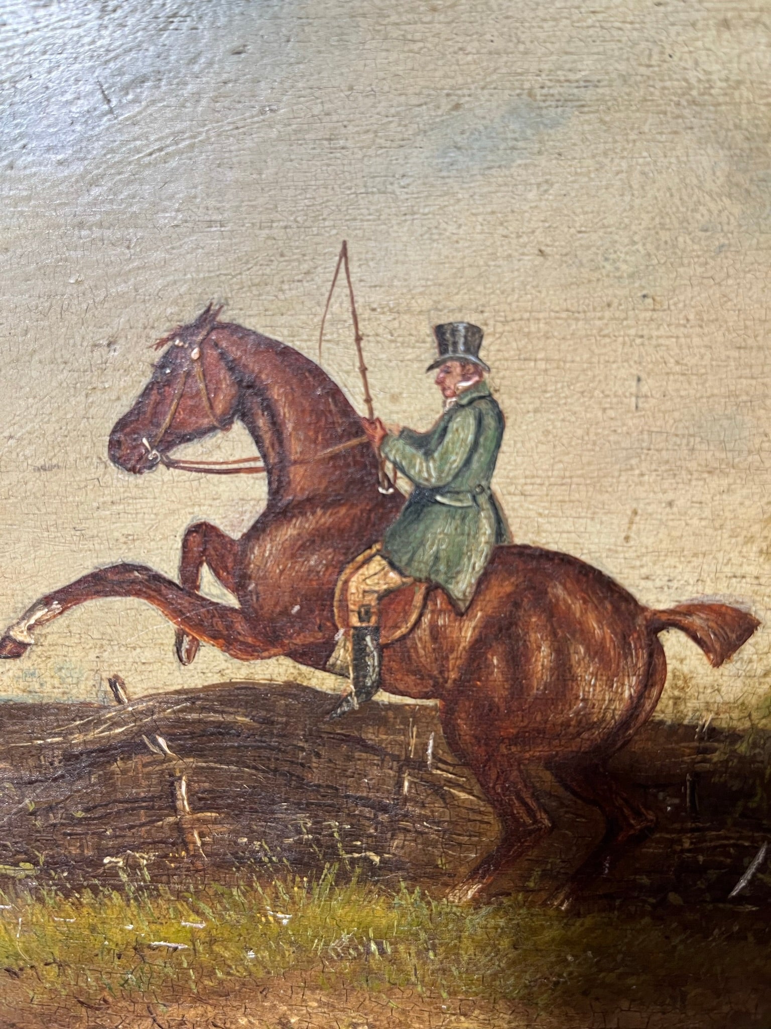 A charming 19th-century oil on board naive painting of a horse and rider taking a fence, possibly fox hunting.