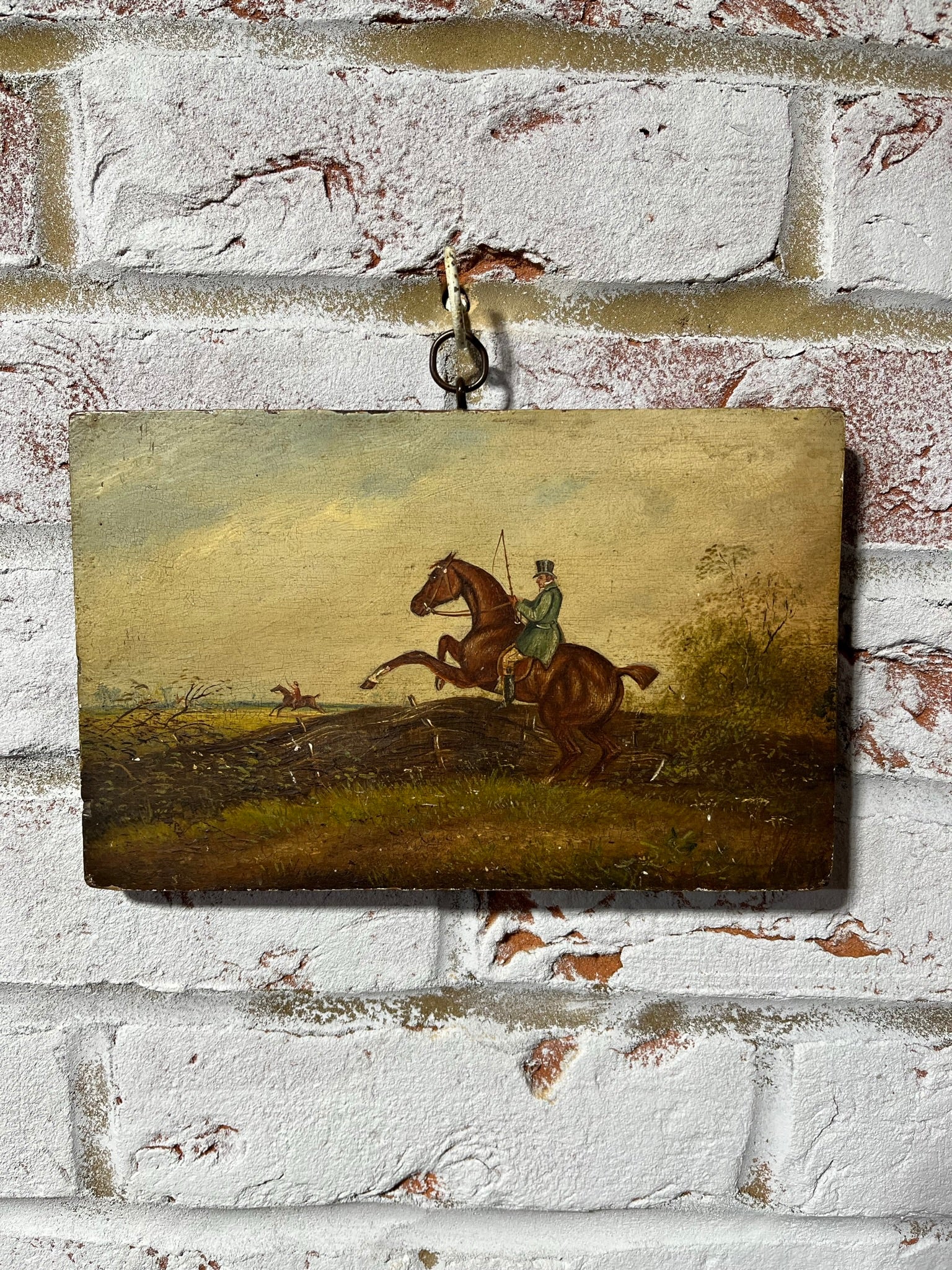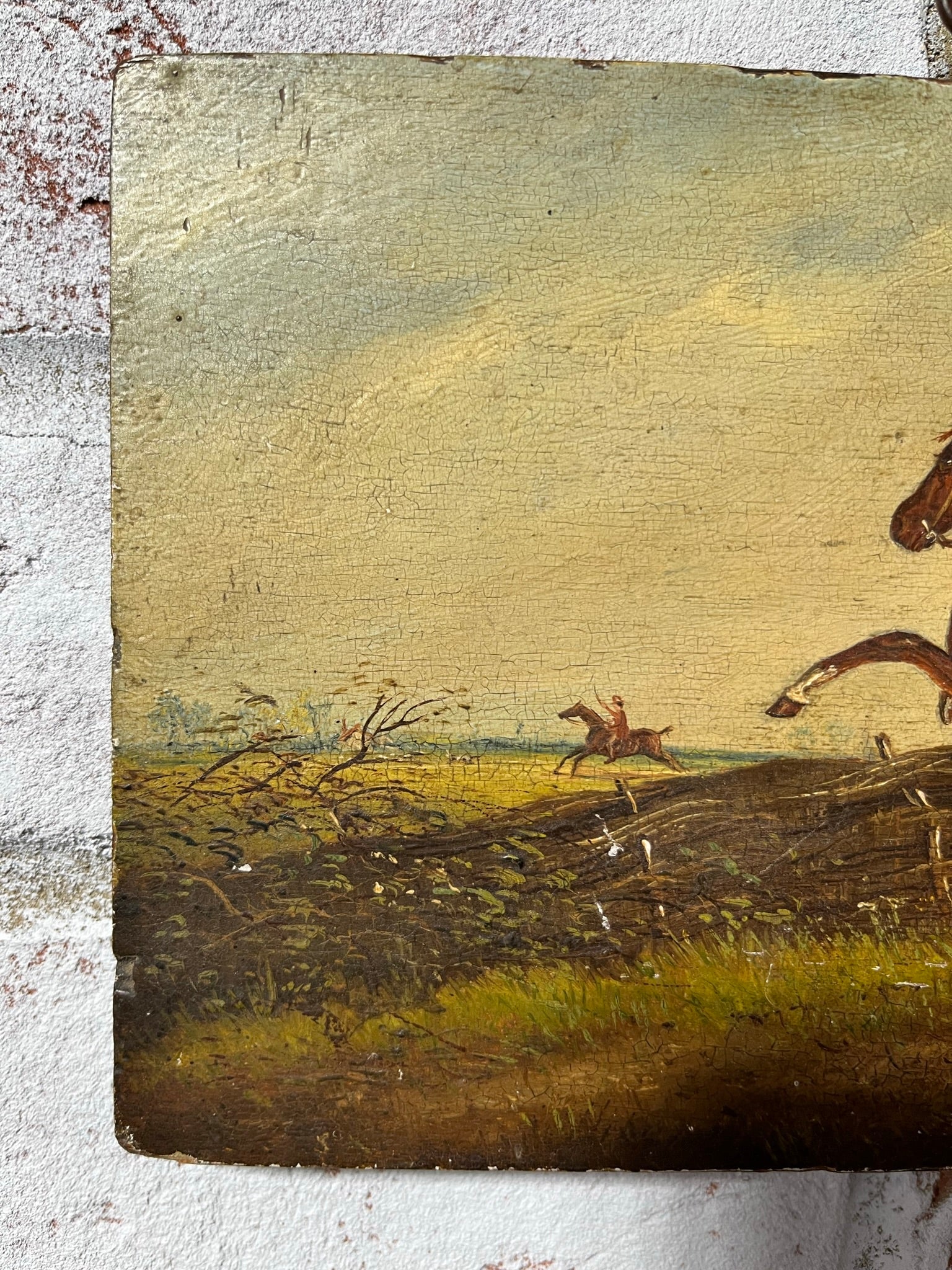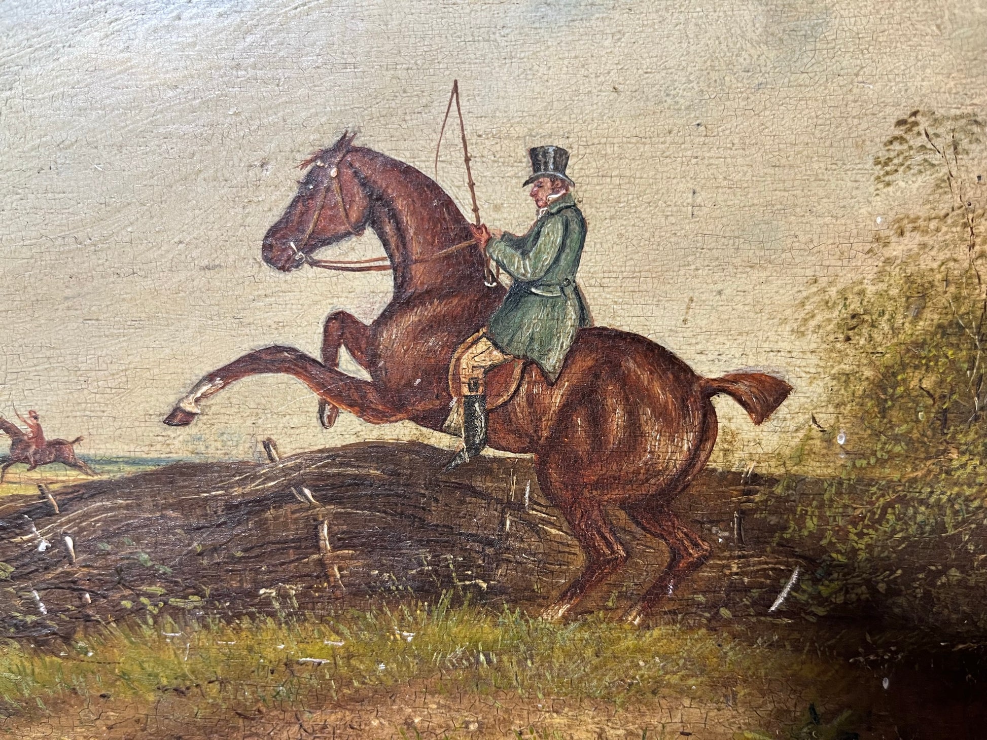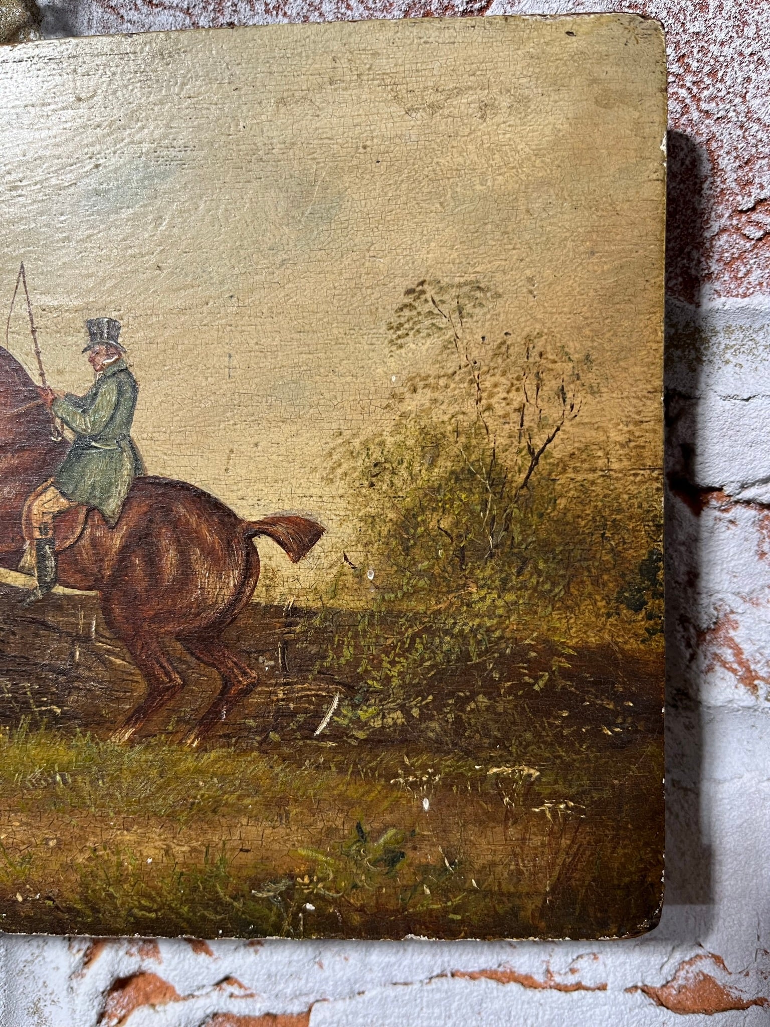 A charming 19th-century oil on board naive painting of a horse and rider taking a fence, possibly fox hunting.