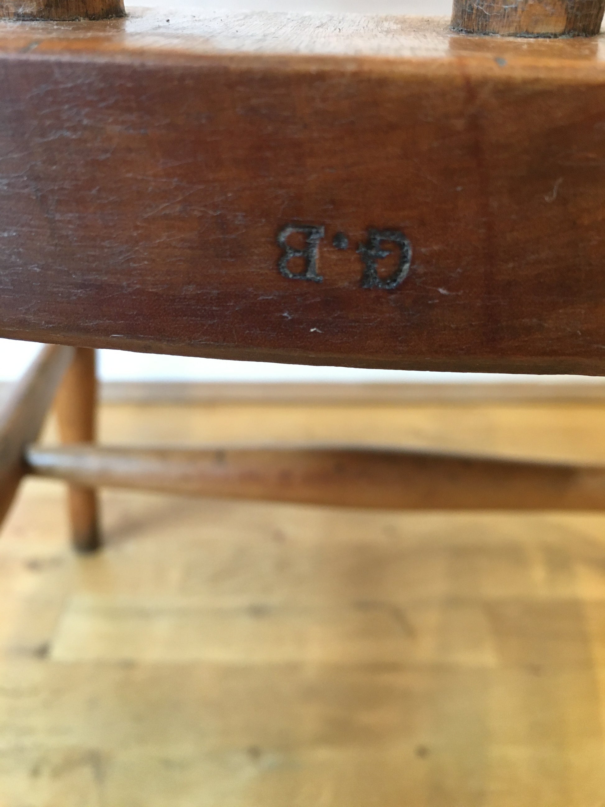 There's a makers mark of an upside-down 'GB' on the back edge of the seat.