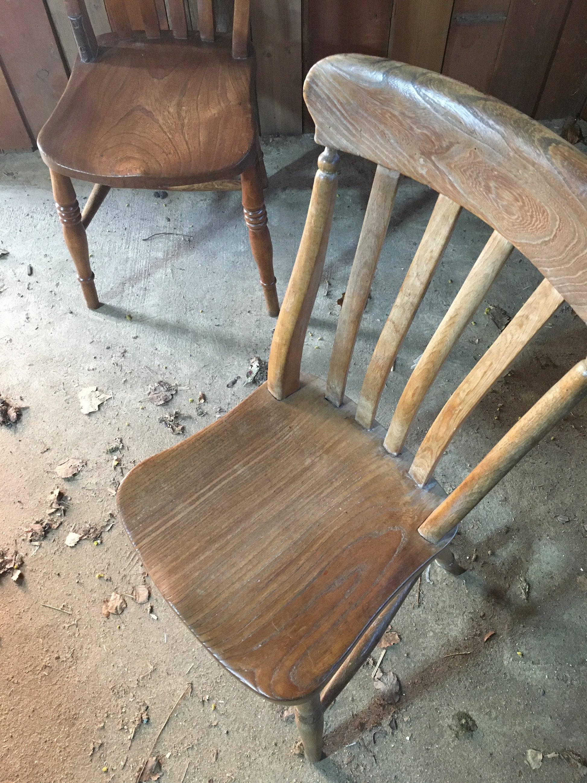 A near pair of good beech and elm Windsor lathe back or slat back country kitchen chairs. The design of the chairs are pretty much identical, just one is paler and less 'red' than the other.