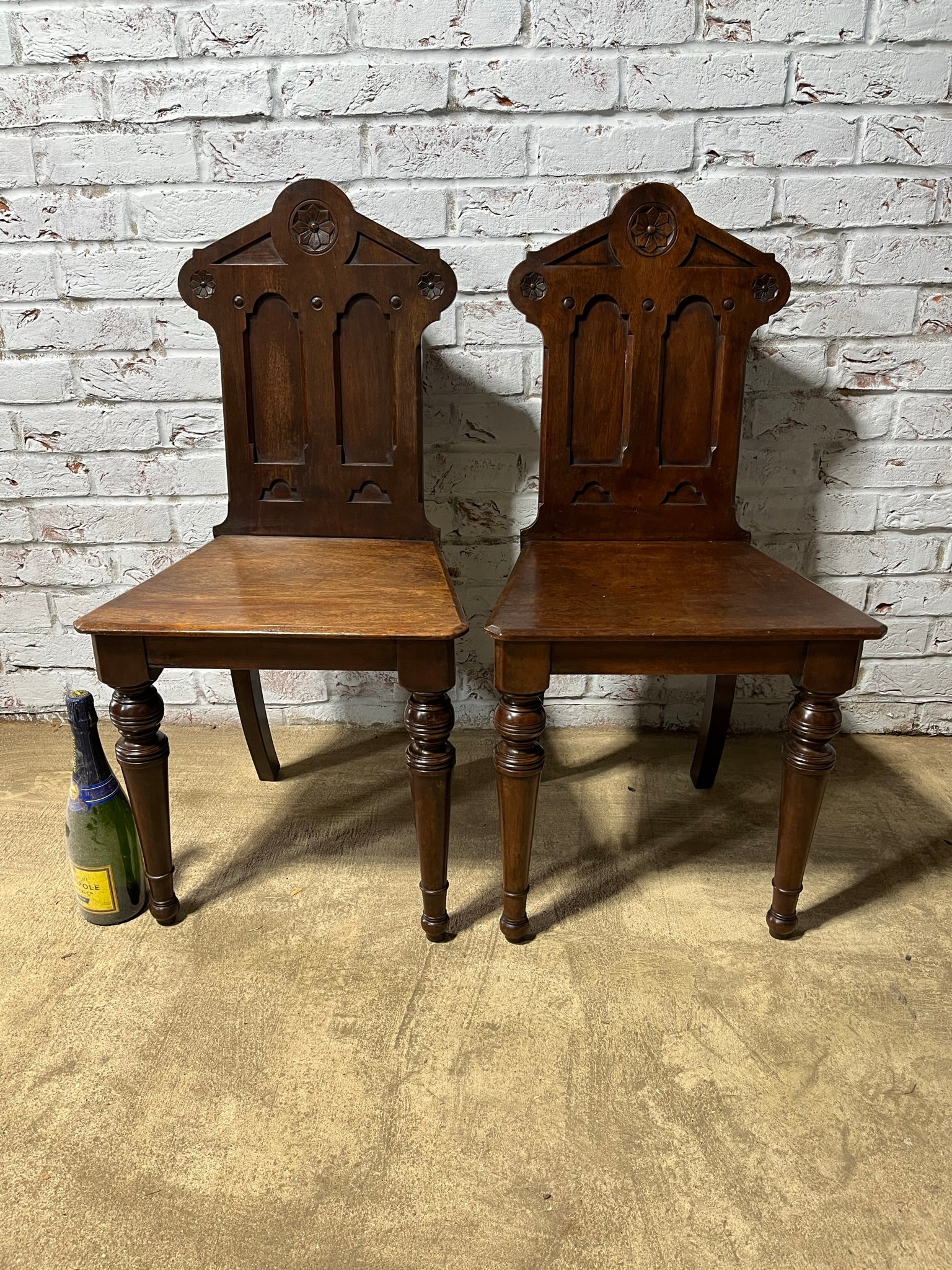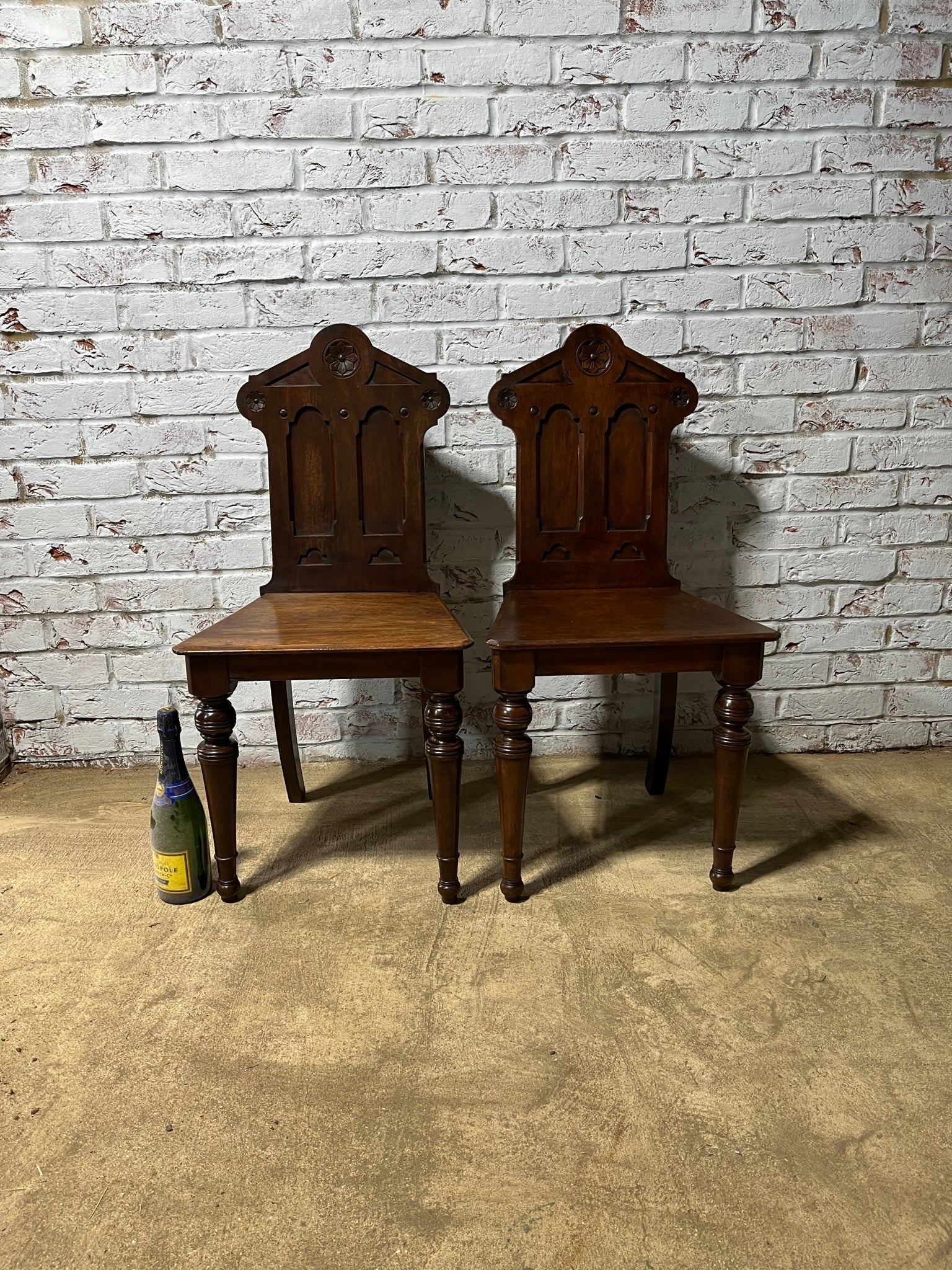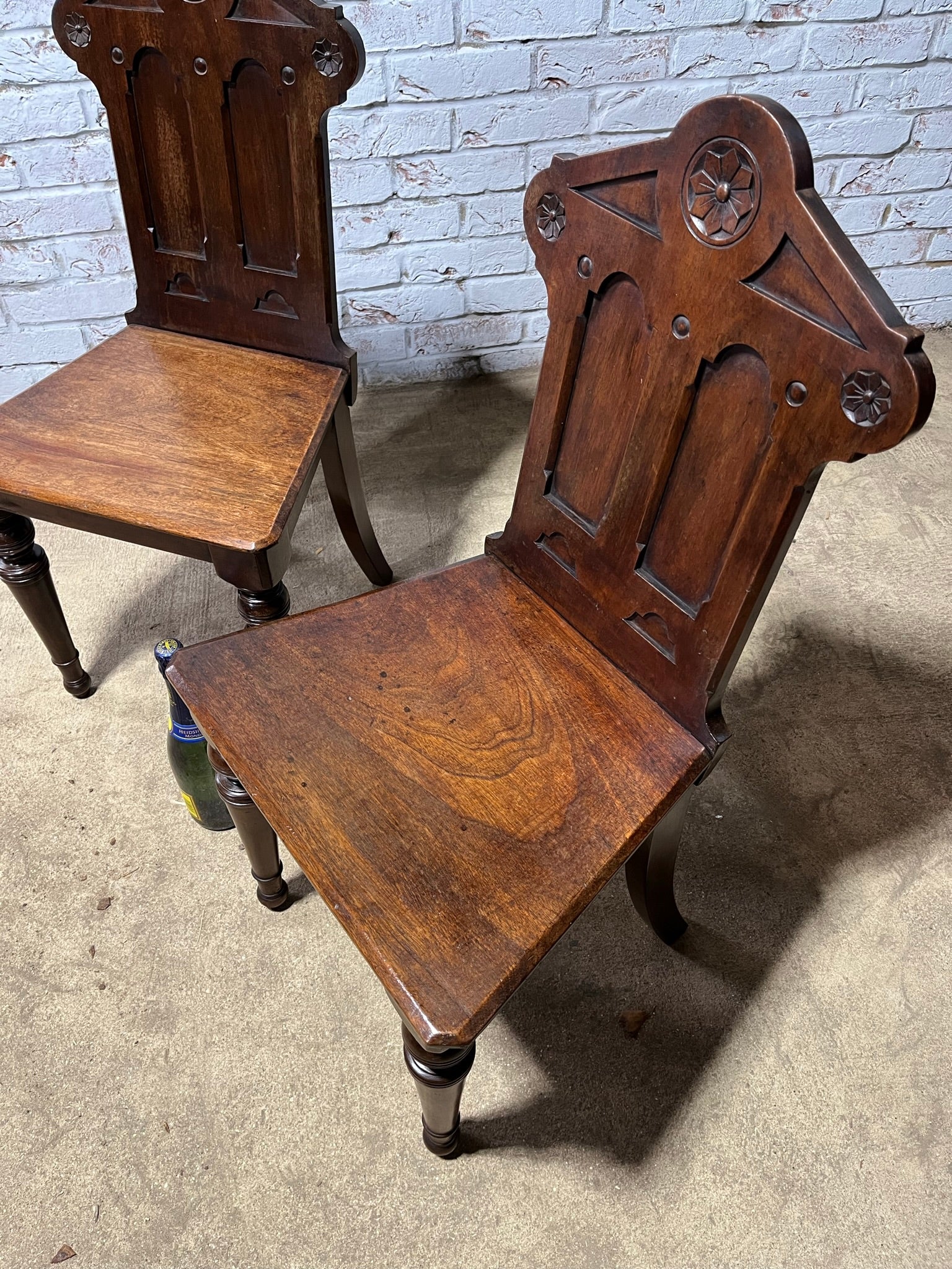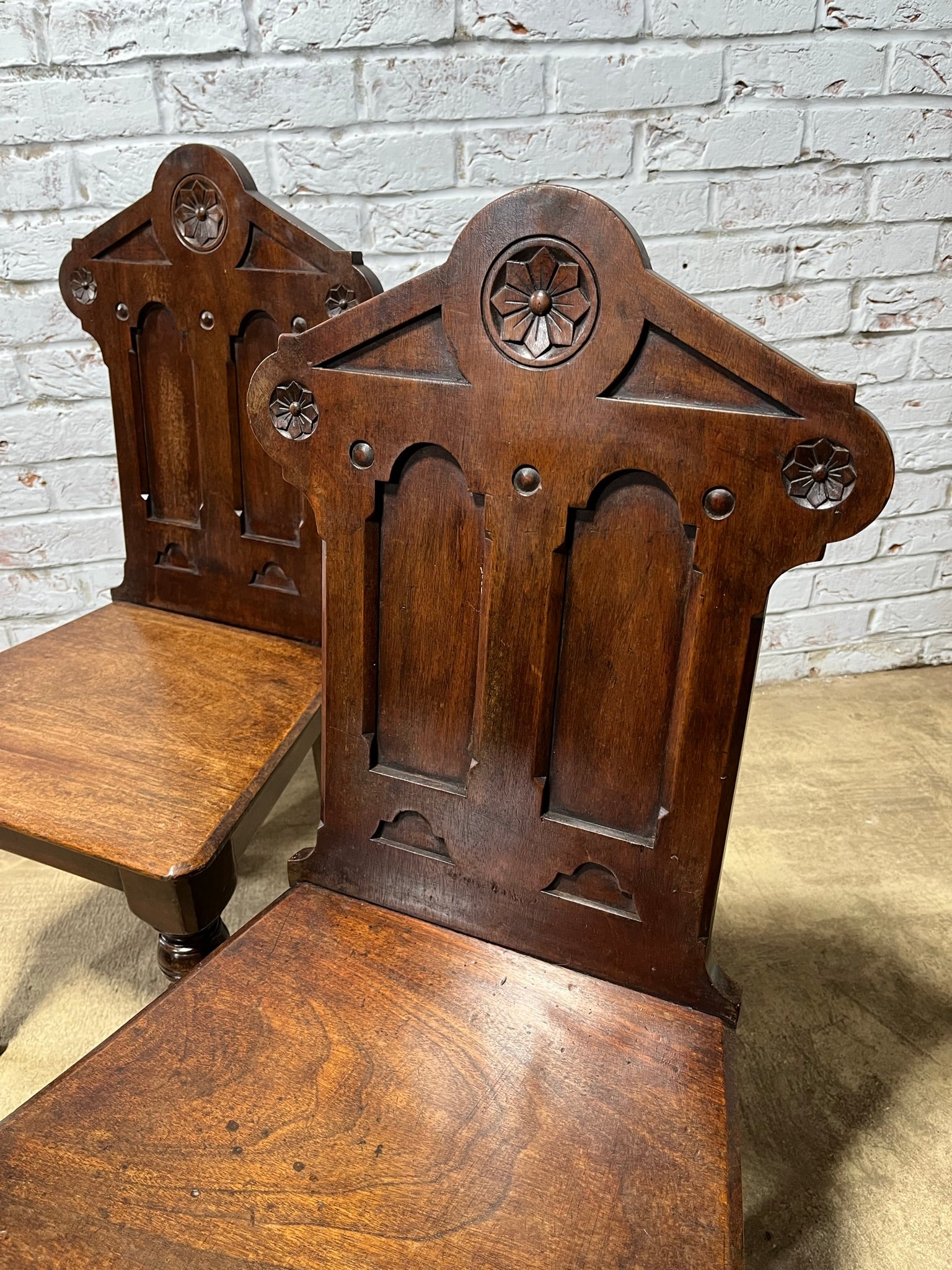 A sweet pair of antique Gothic hall chairs, with panelled backs, solid seats and well-turned tapering front legs.