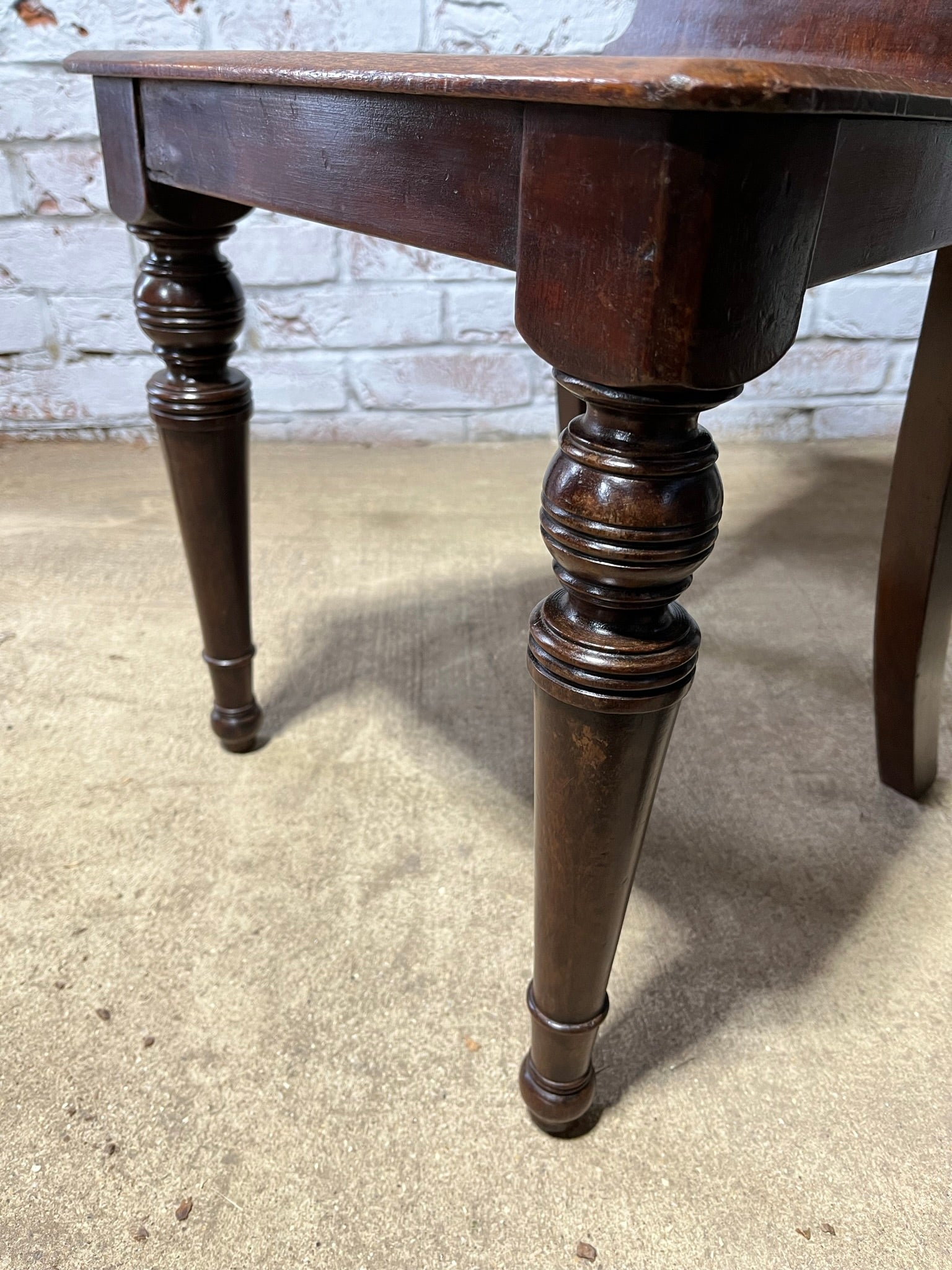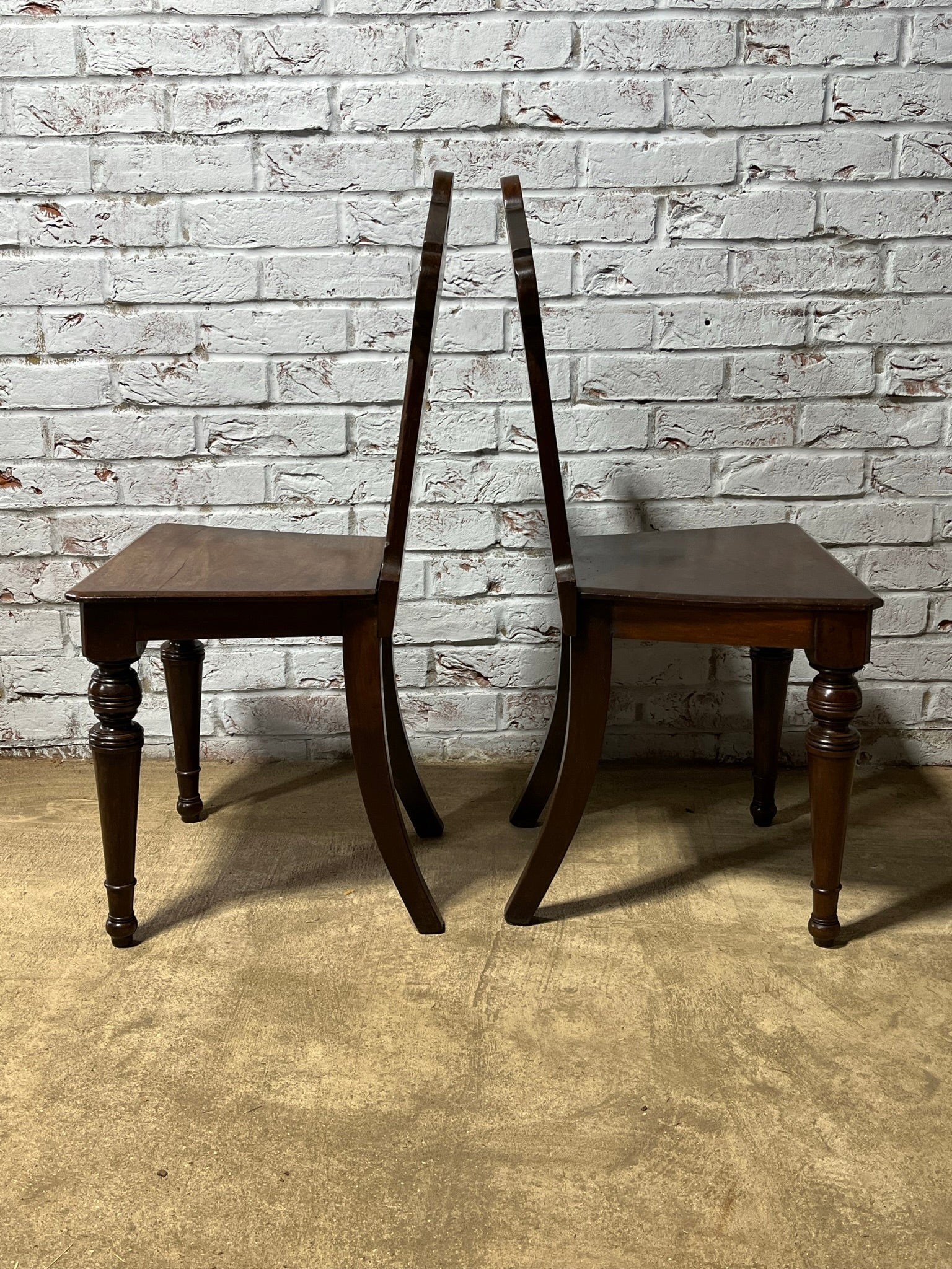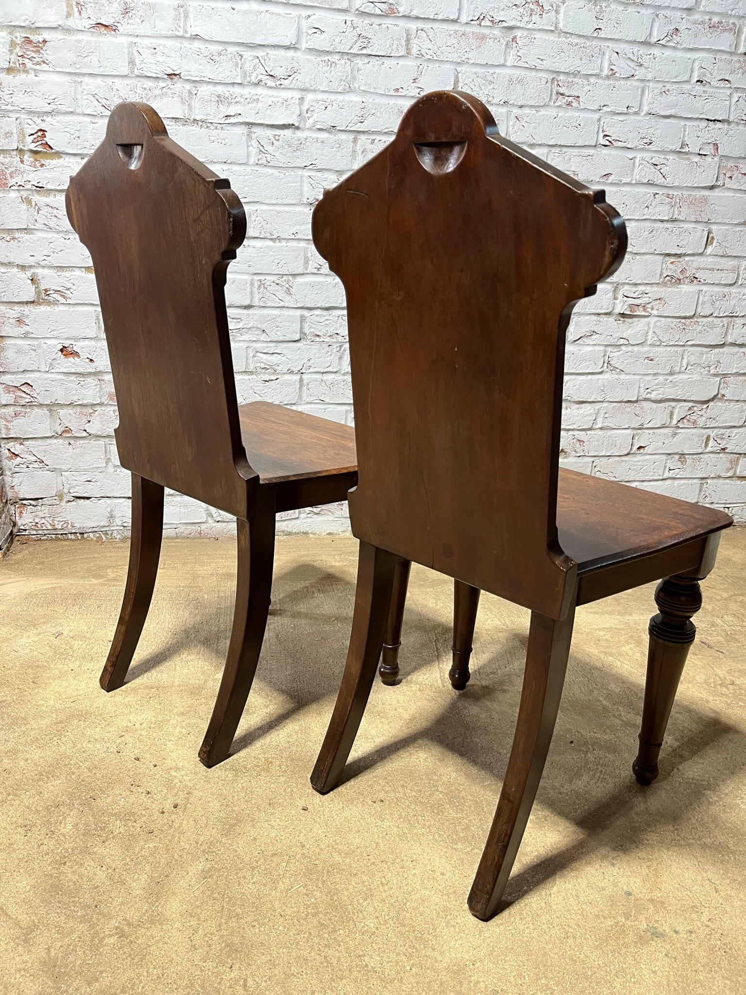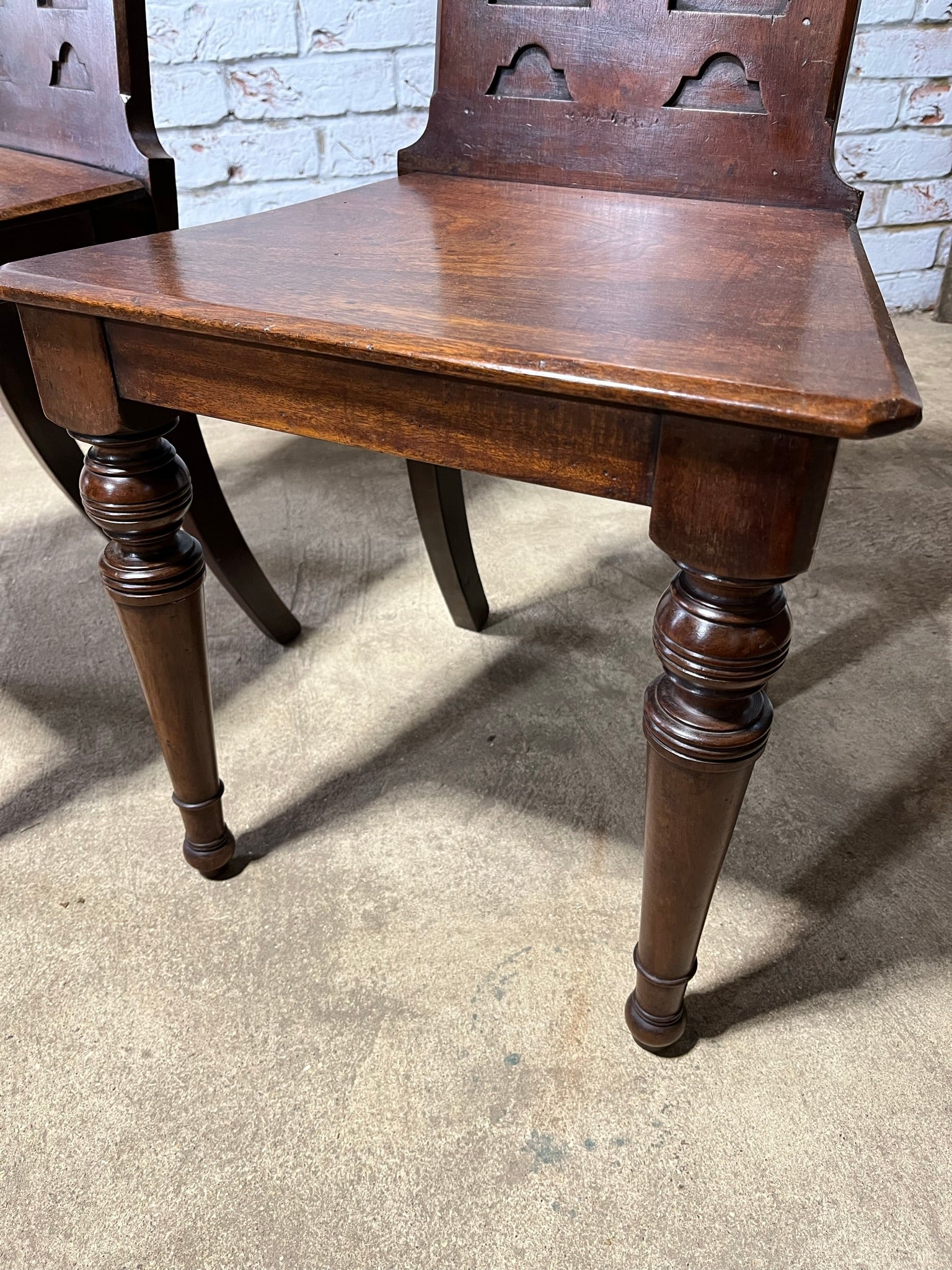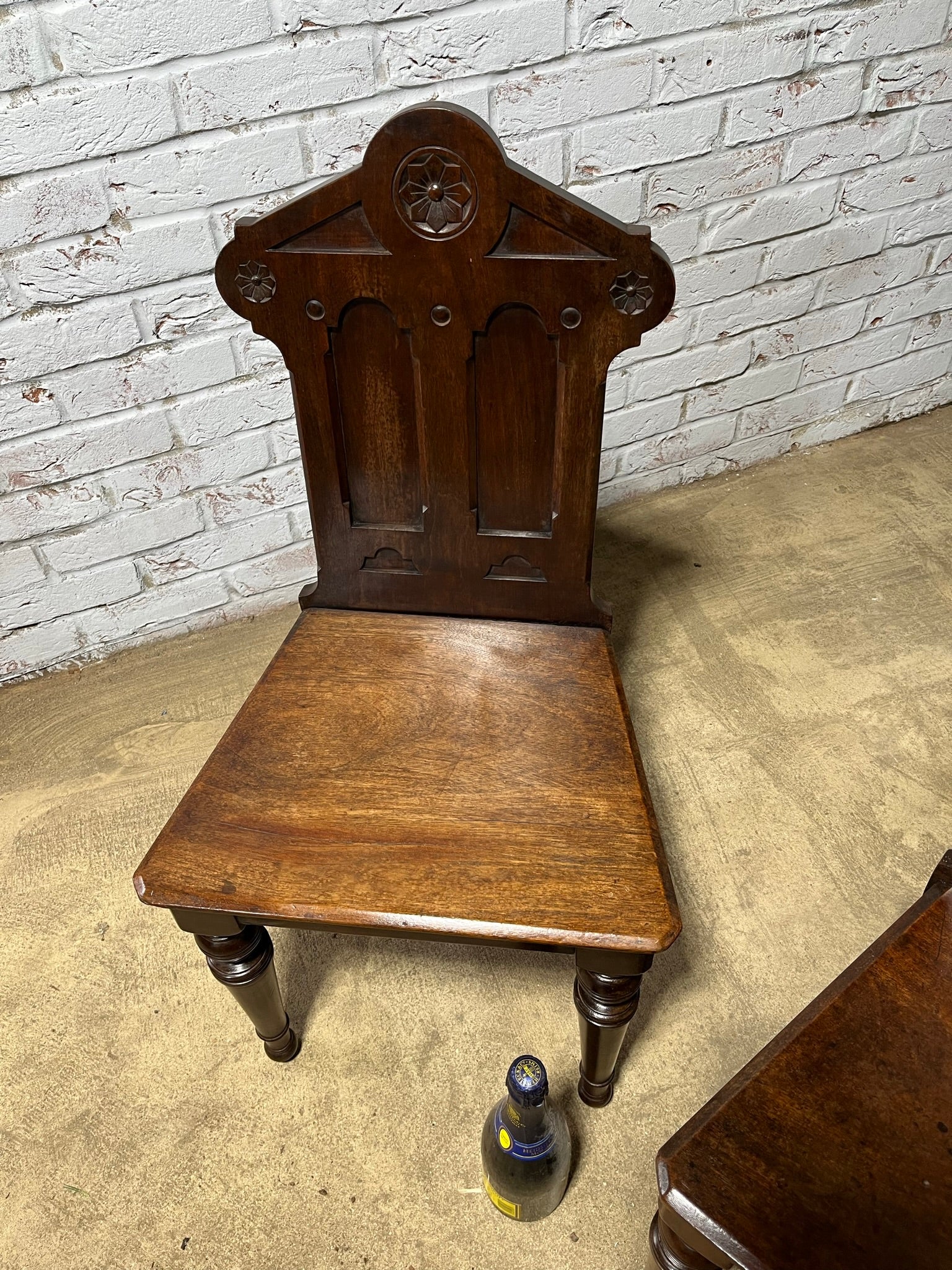 A sweet pair of antique Gothic hall chairs, with panelled backs, solid seats and well-turned tapering front legs.