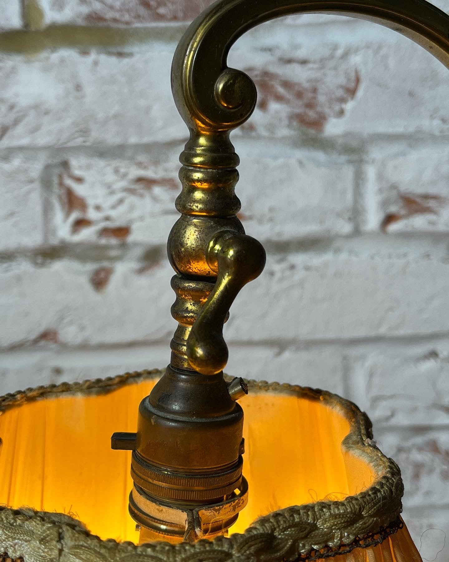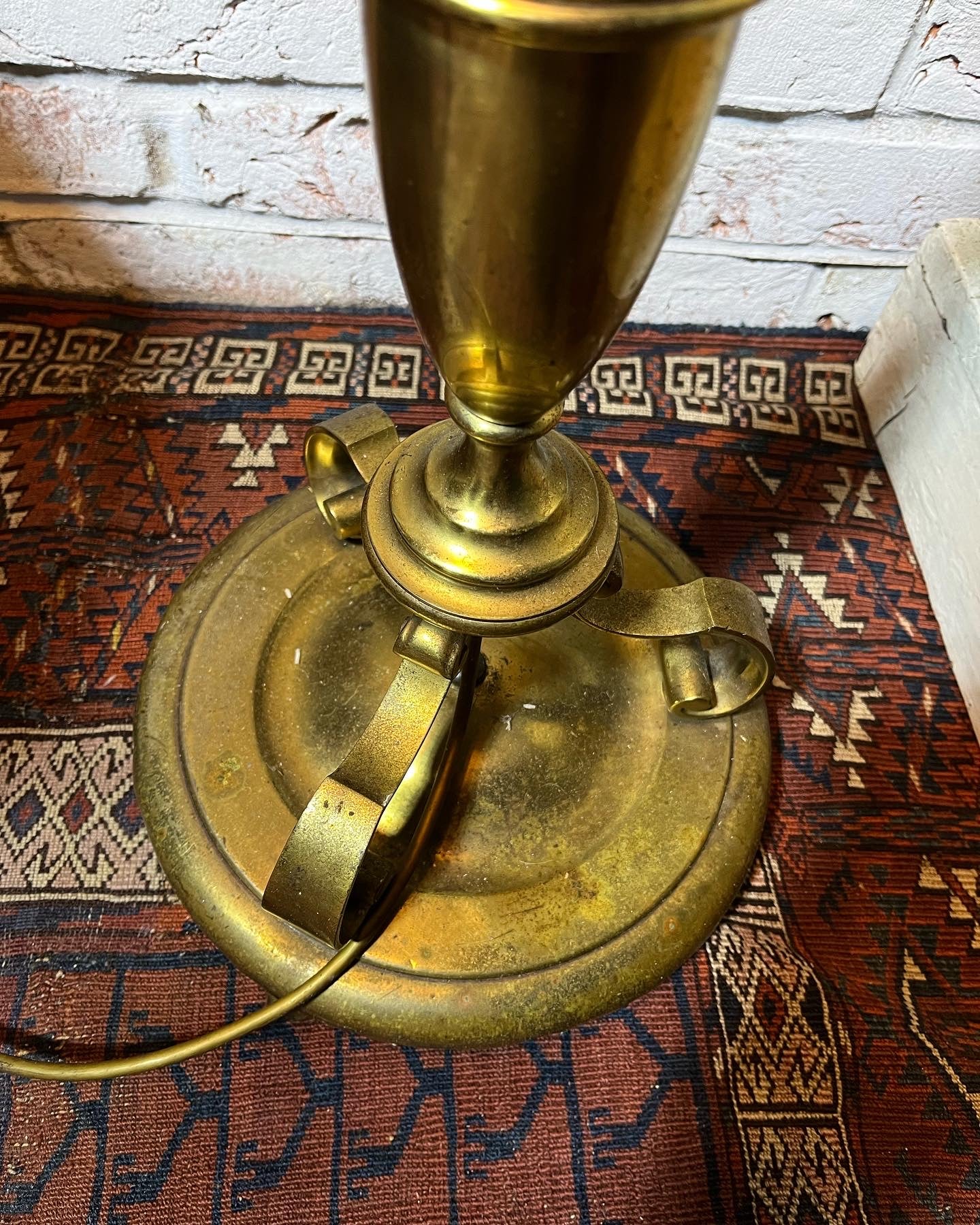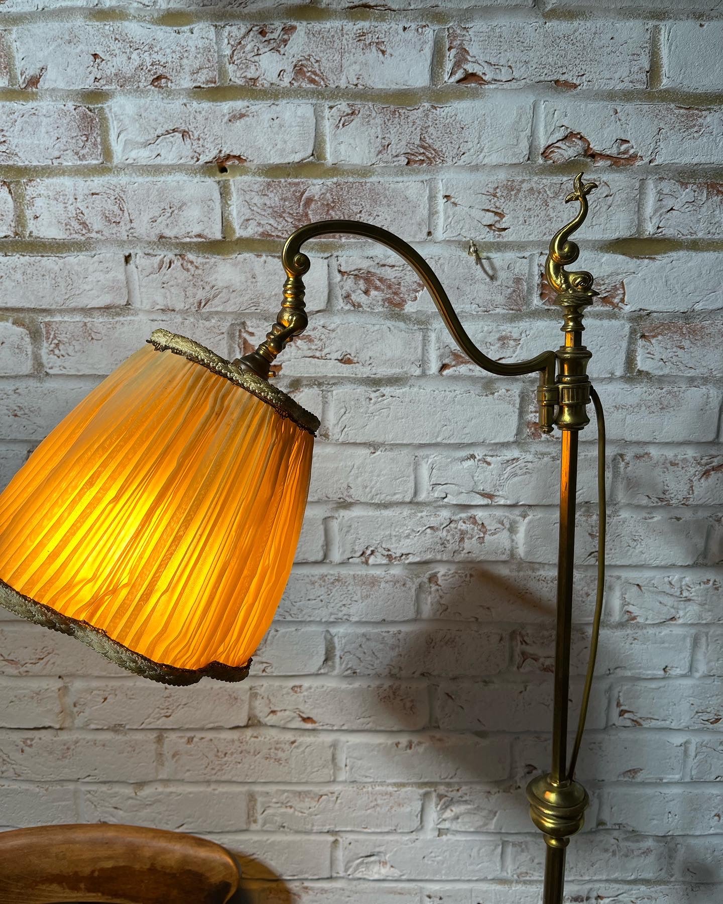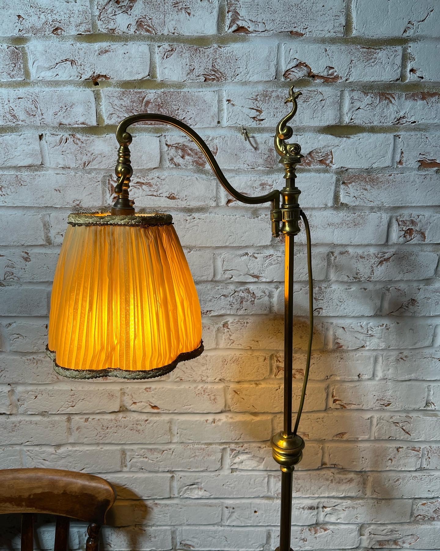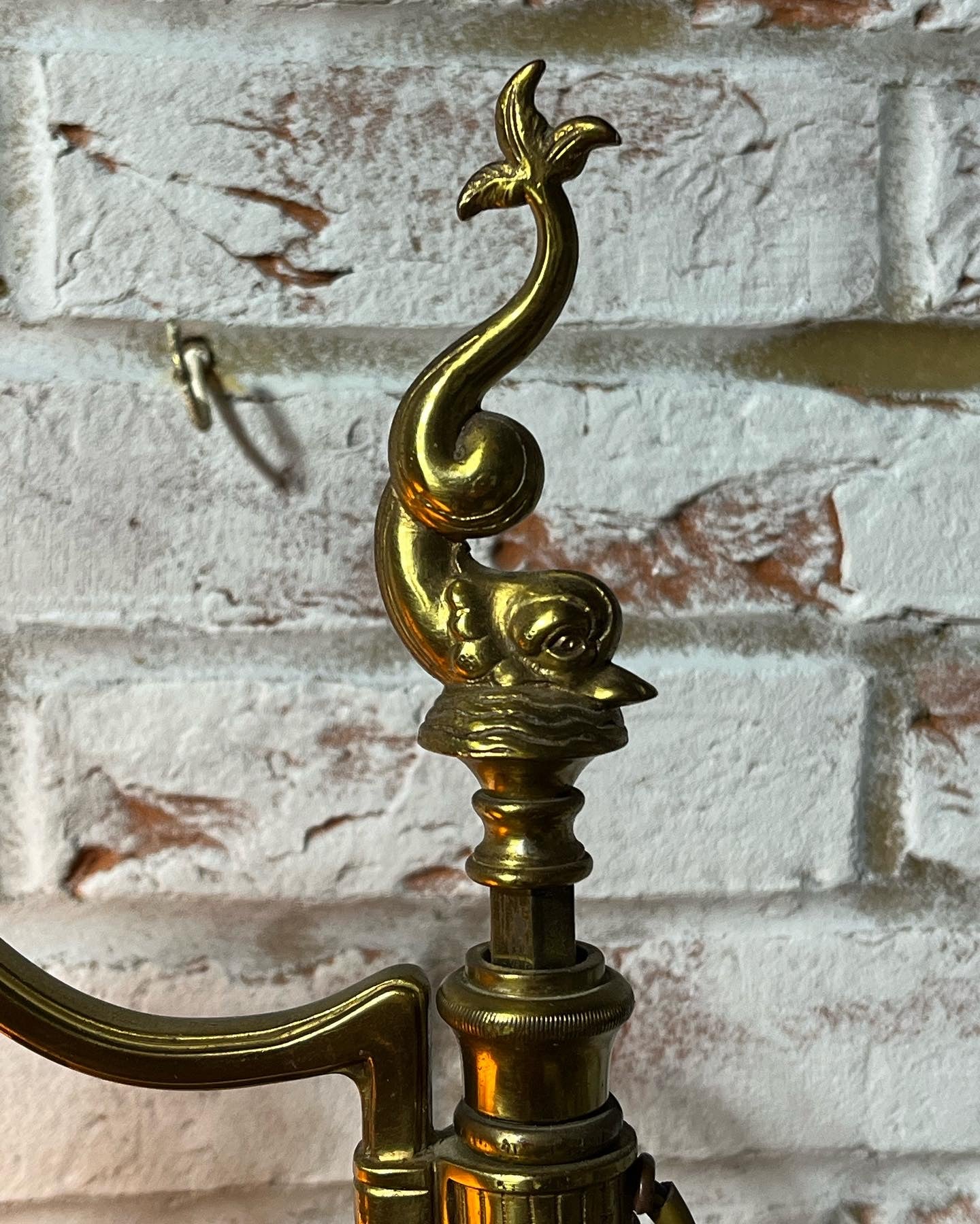 A good, heavy, early 20th-century brass standard lamp, with adjustable angle bulb holder, telescopic top half (see photos) and dolphin-like motif at the top. Comes with a very pretty shade that looks original.