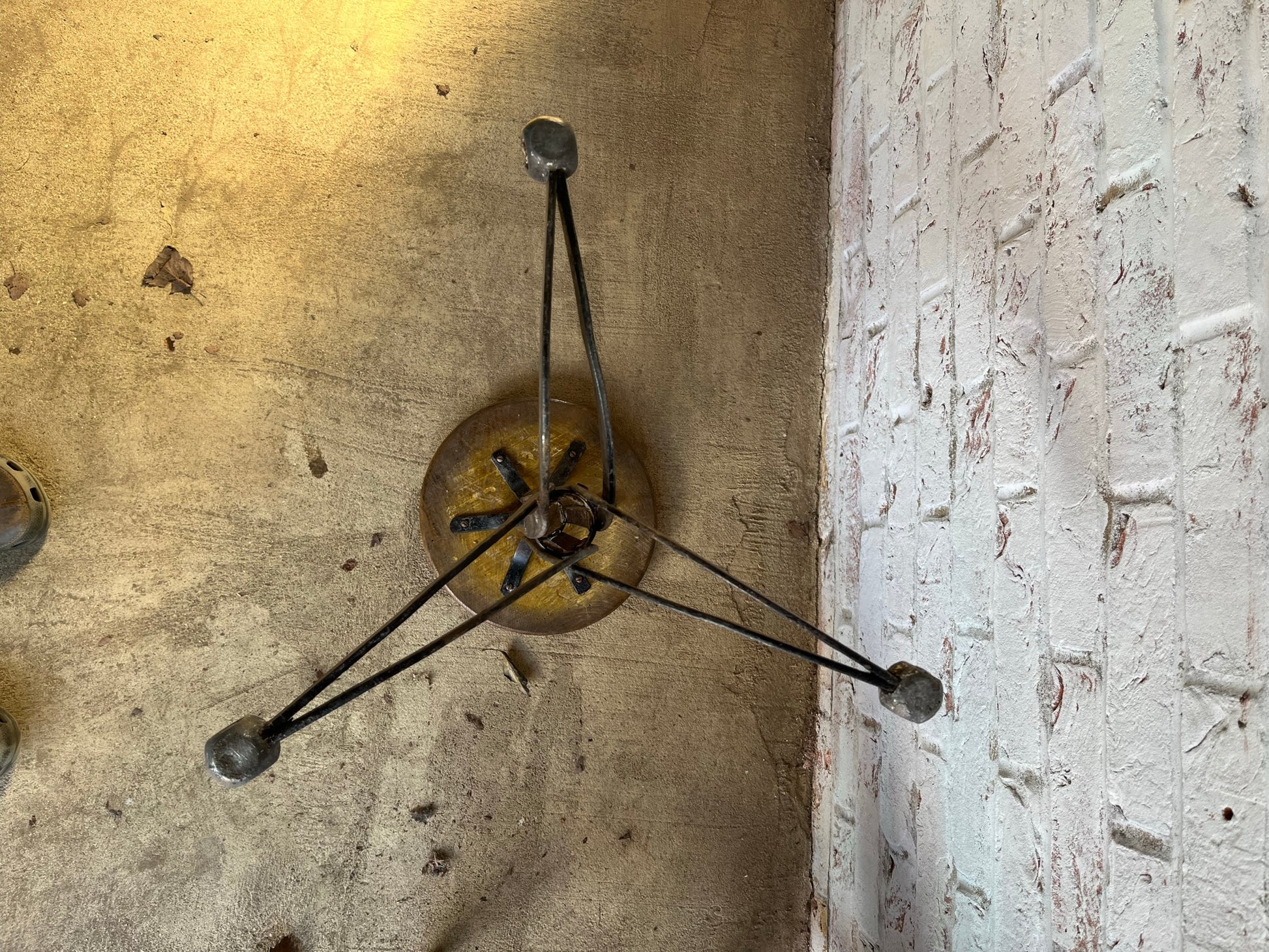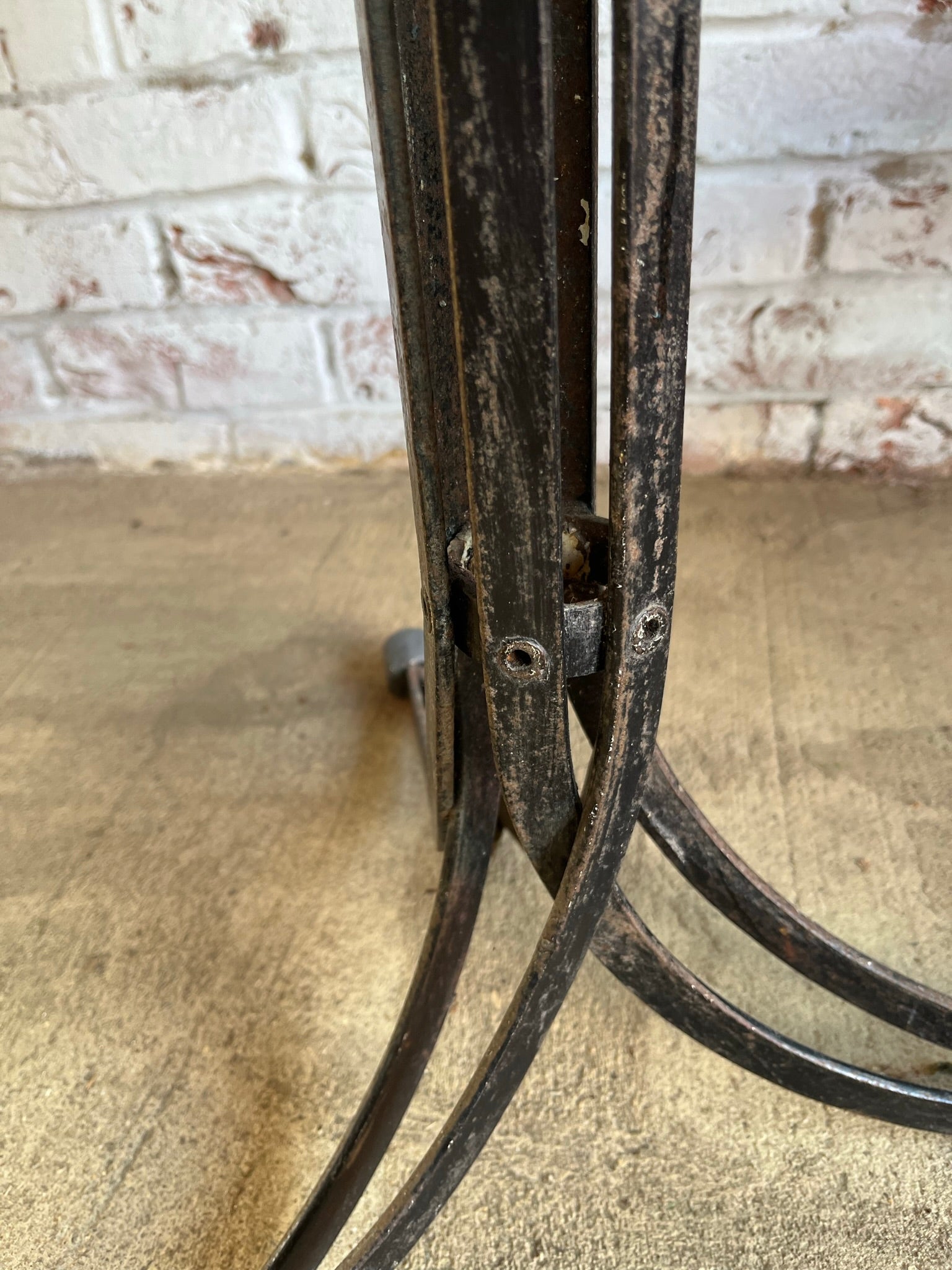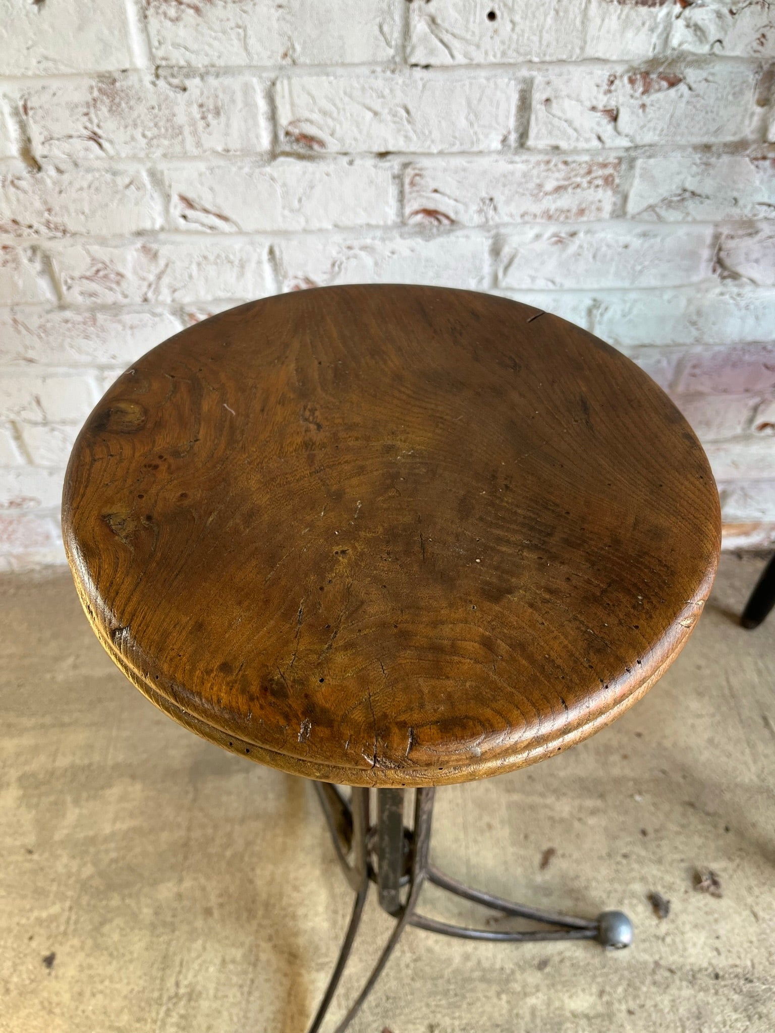 A rare Rubery Owen vintage industrial stool with the distinctive and elegant six-part blade base, circa 1940, original flakey paint finish and elm double layer seat.