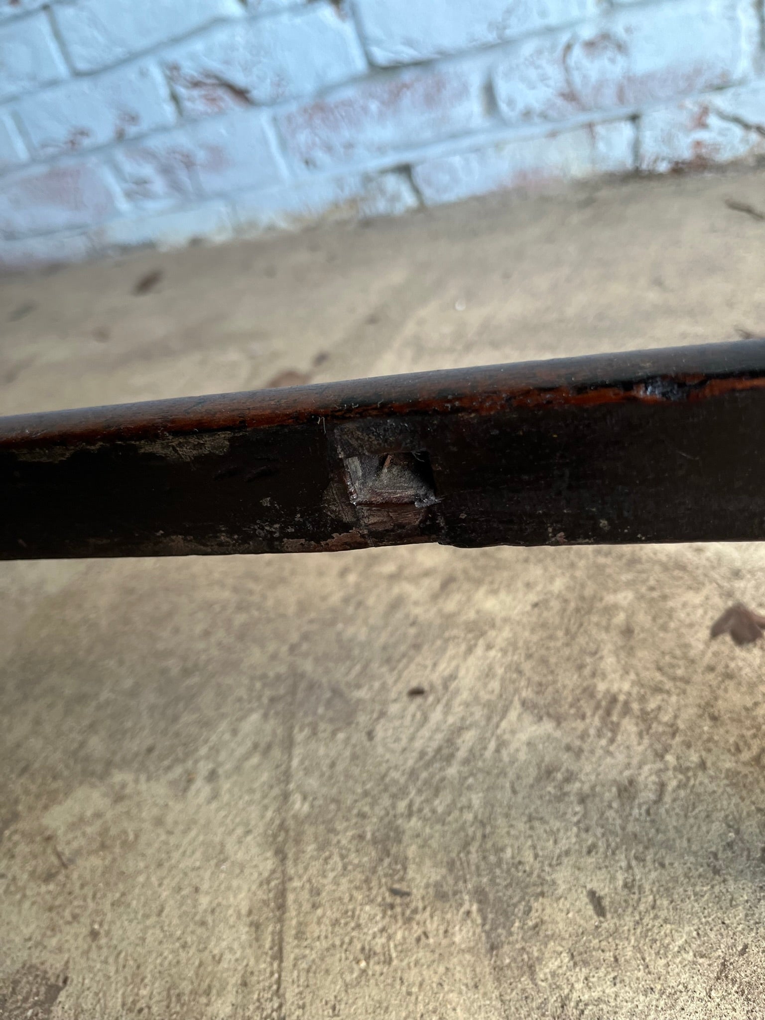Timeworn and full of character, tears to the leather which I've left as found, but still very solid with no movement or dodgy repairs and still useable, I've just given it a wax polish. Missing the stretcher across the middle which I might restore with period wood if I get round to it, but still very nice as is.