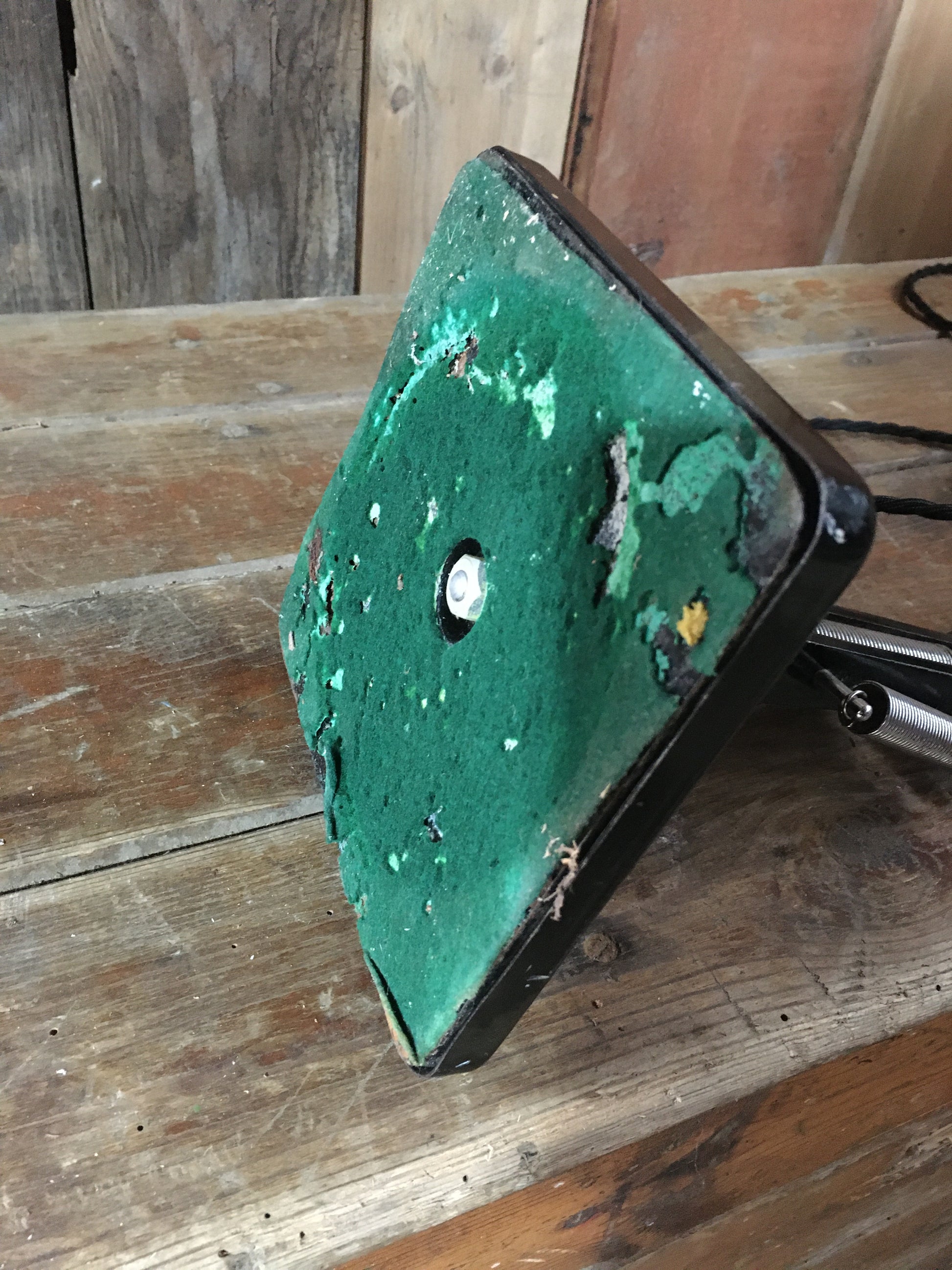 Due to some of the design elements - e.g. the rolled-out rim of the shade, the rounded-edged back of the shade, the metal cross bolts and hinges, etc., - this design classic is accurately dated to between 1948 and 1960, and probably the earlier end of that date range.
