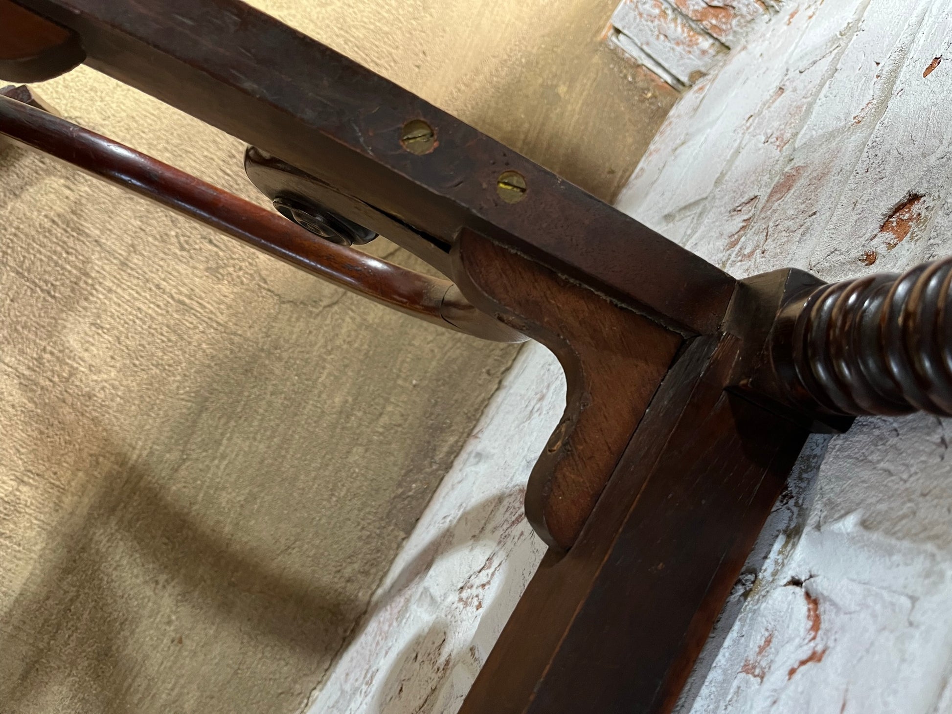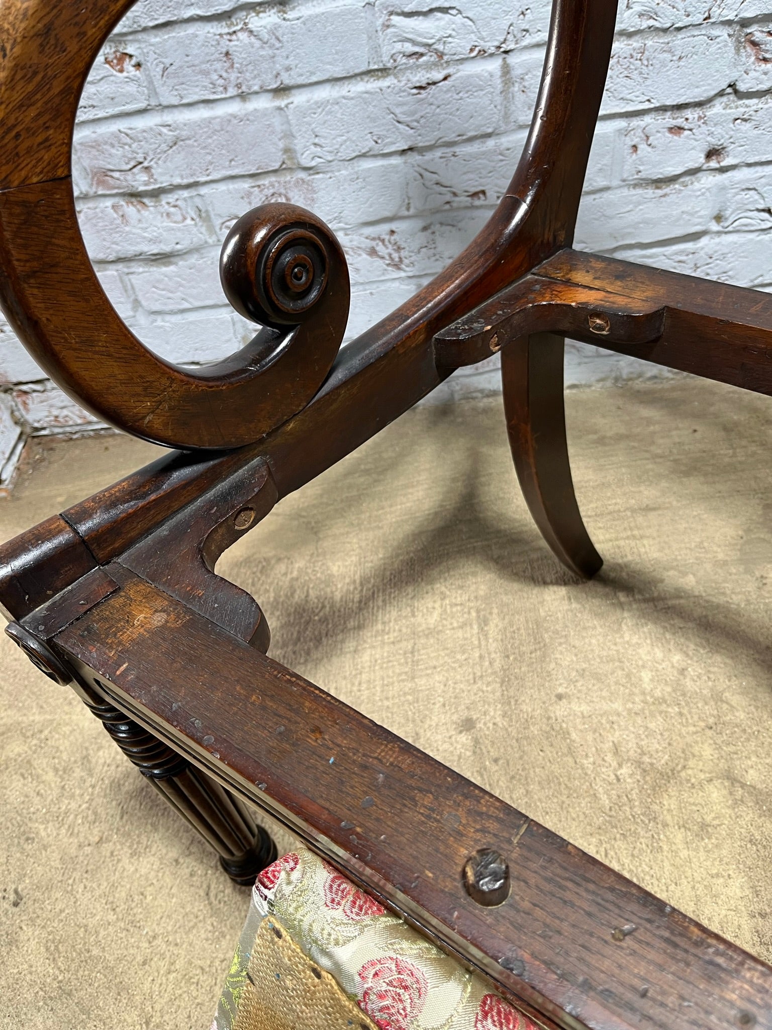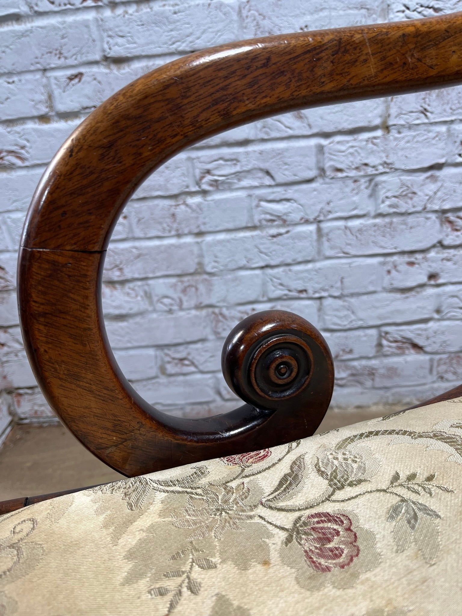 Great colour and rich patina, with wonderful scrolling arms, nicely turned and detailed front legs, sweeping back legs, curved backrest and refined fabric.