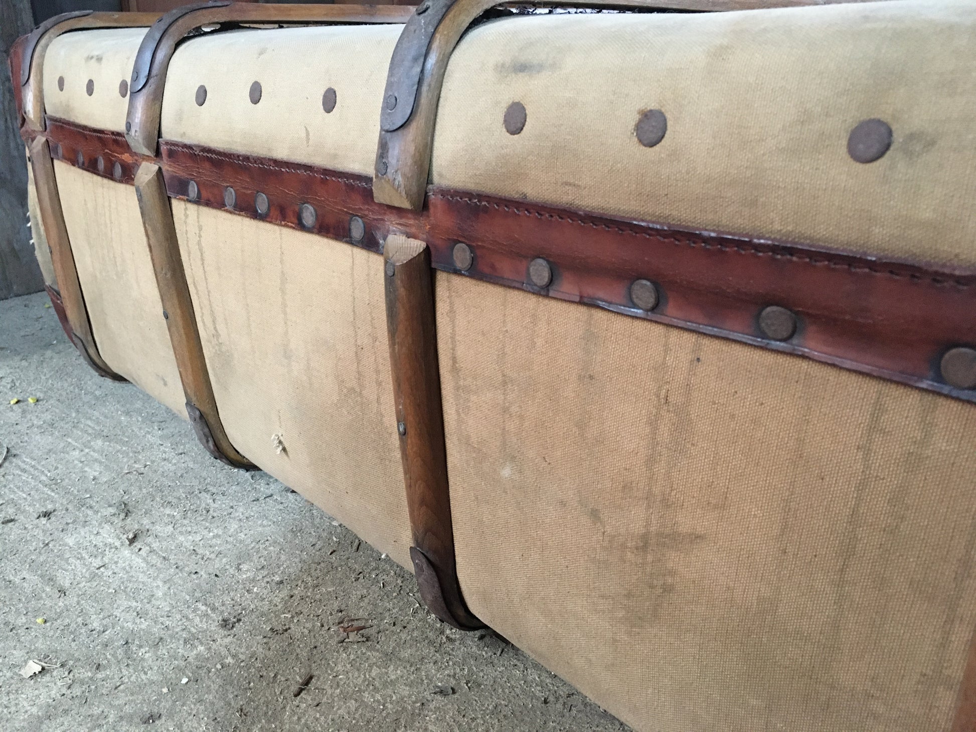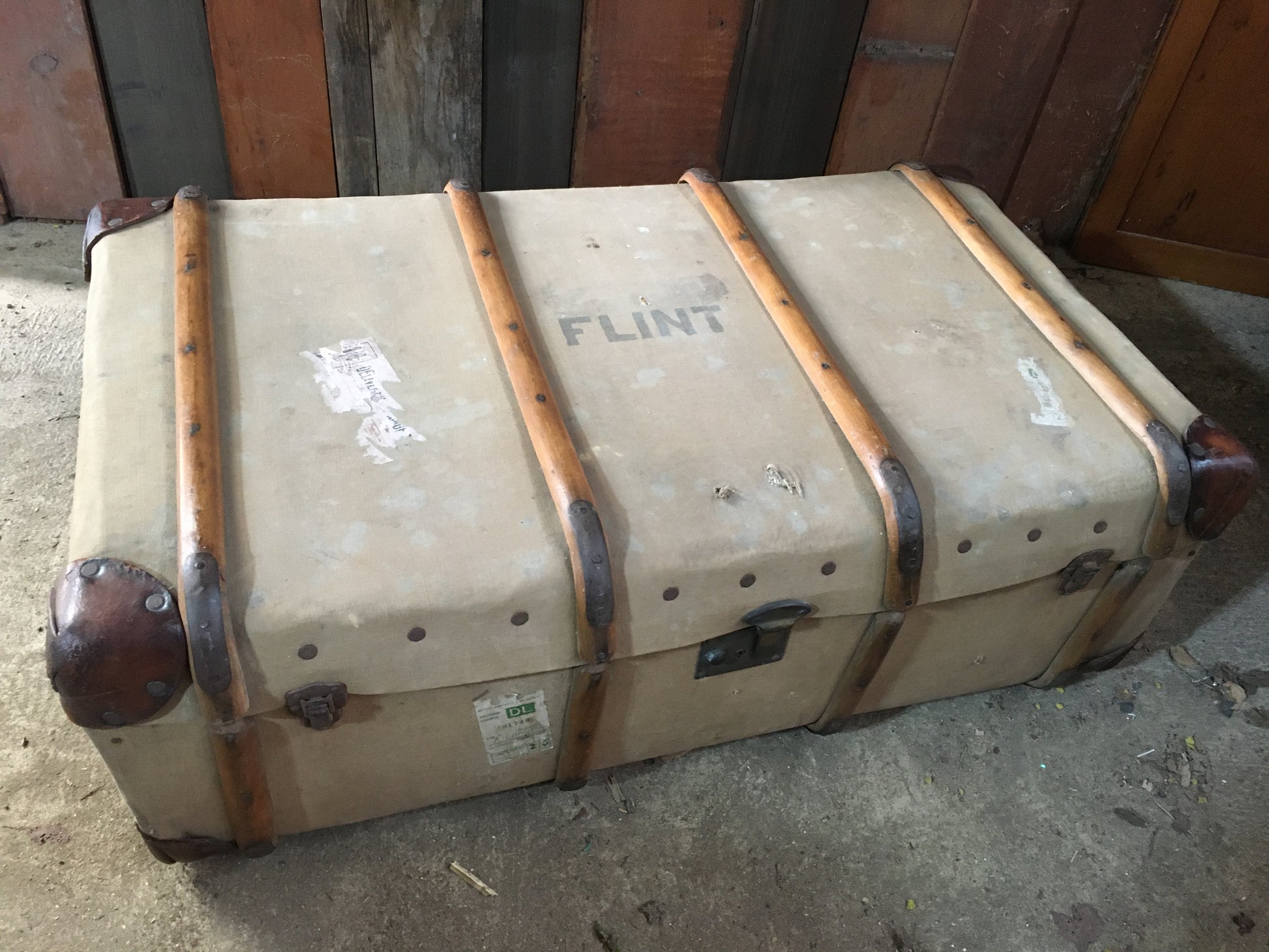 Here we have an interesting, untouched original vintage steamer or travel trunk, with wooden protective slats, thick leather corners and handles, leather banding, working latches and lock (no key) and original vintage labeling.