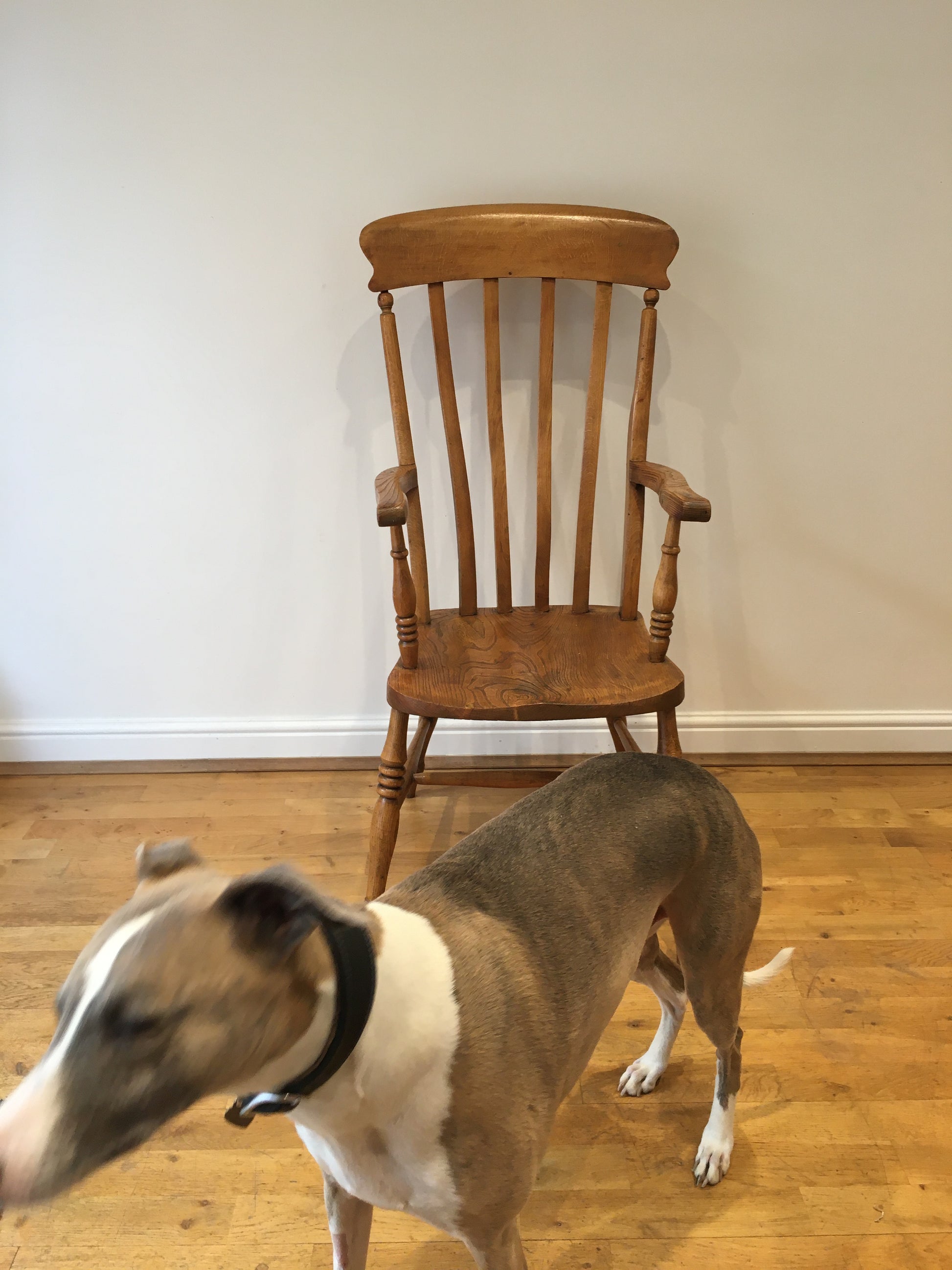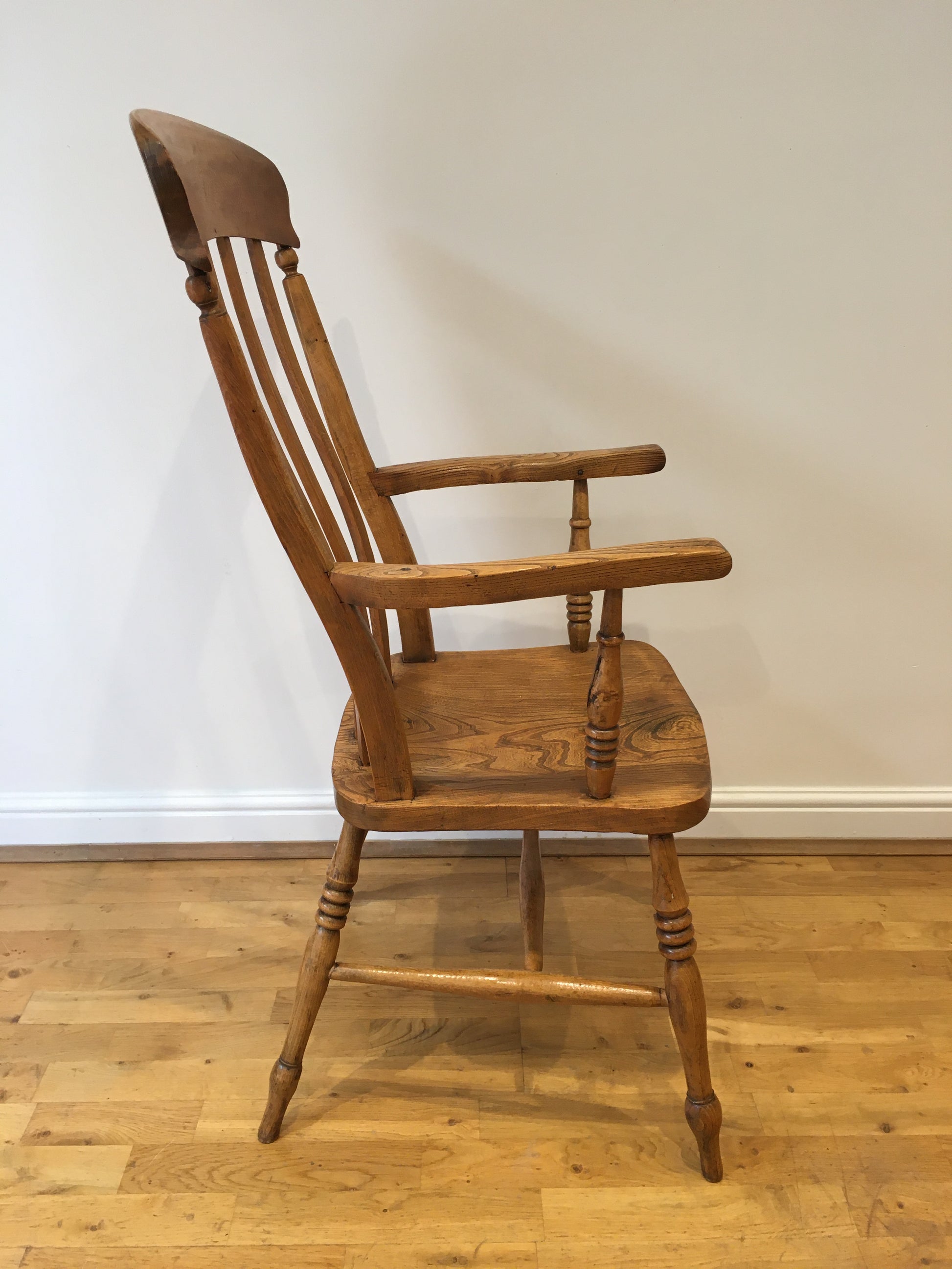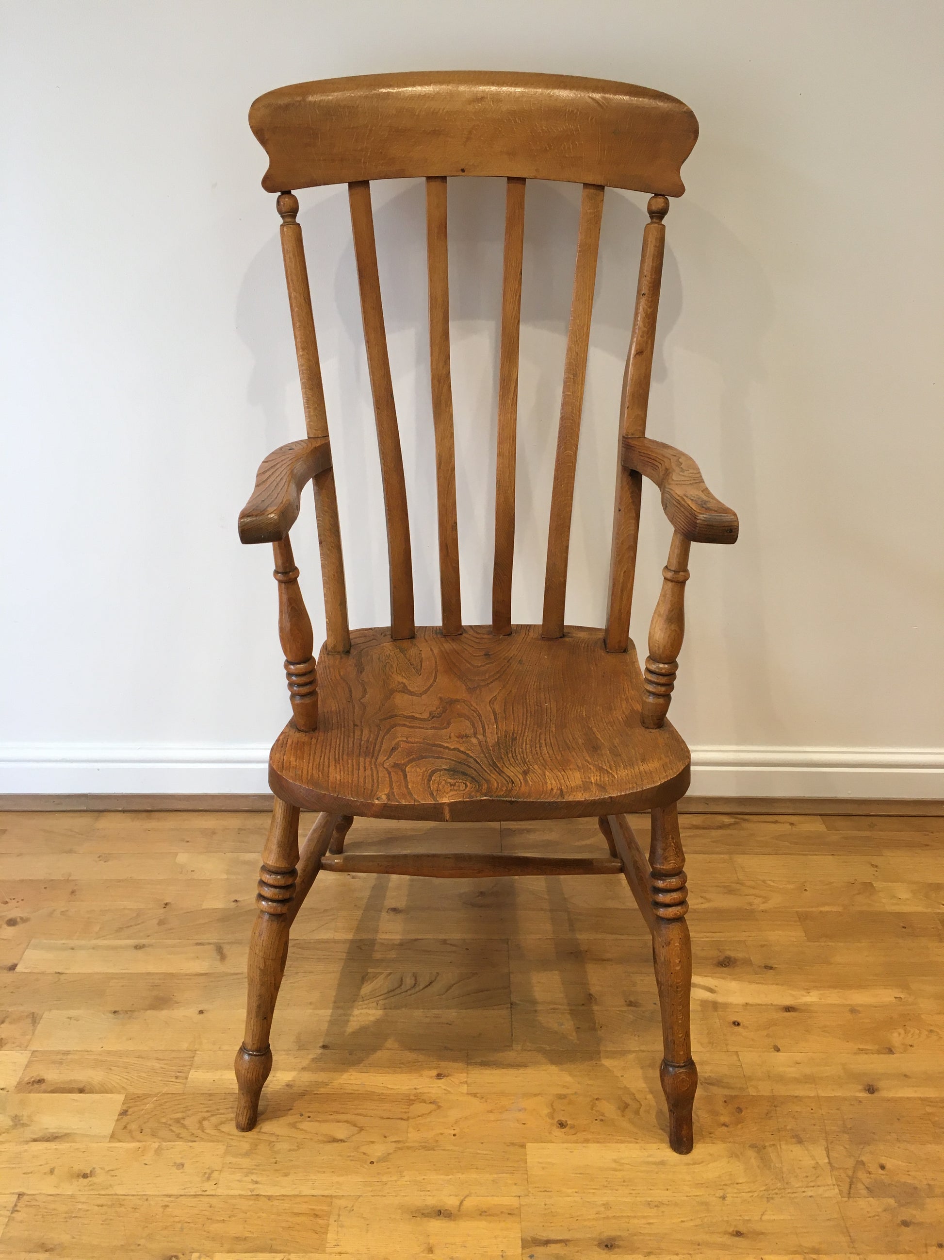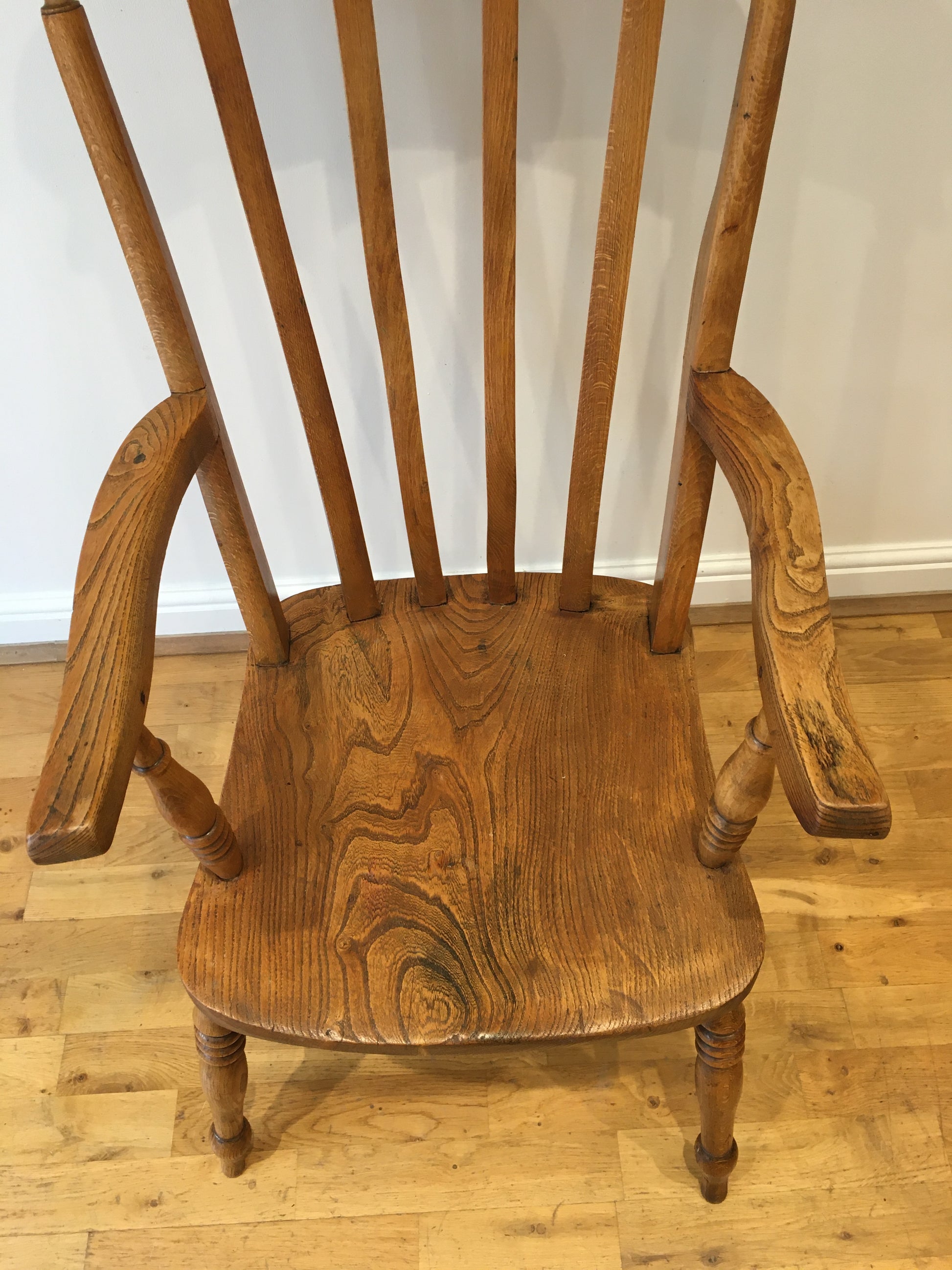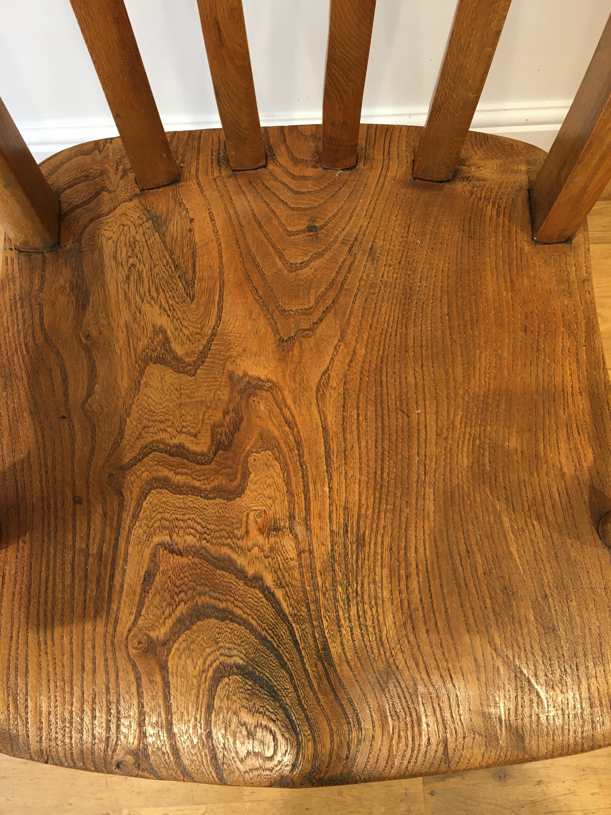 The elm seat and well-turned arms showing a wonderfully swirling grain, the whole chair has taken on a lovely colour.