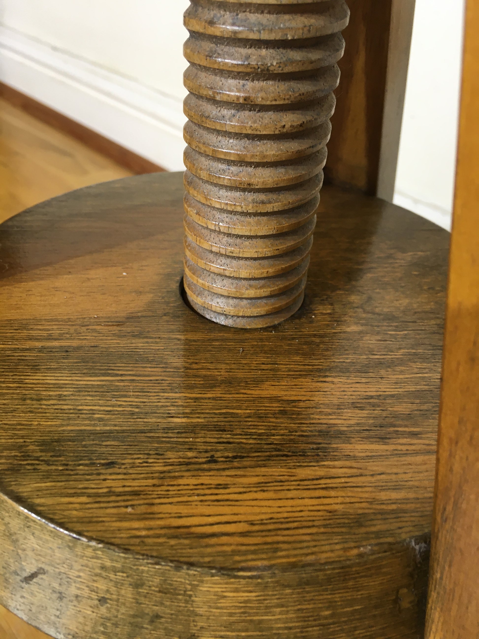 Height-adjustable via wind up/wind down wooden corkscrew mechanism.