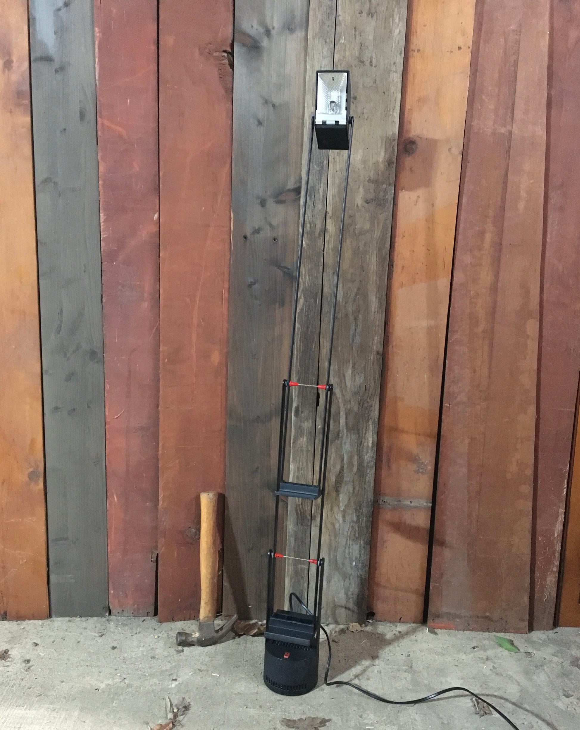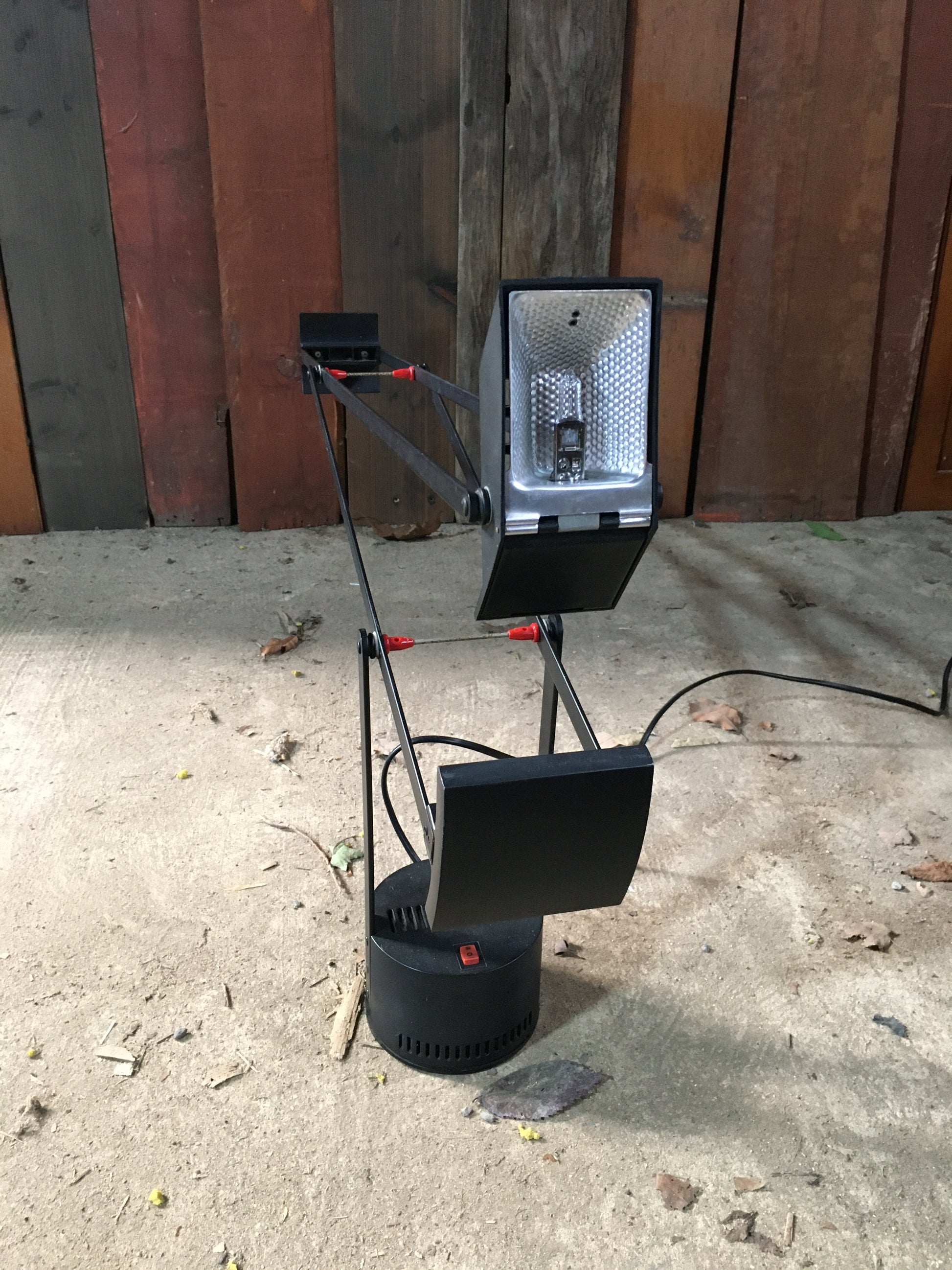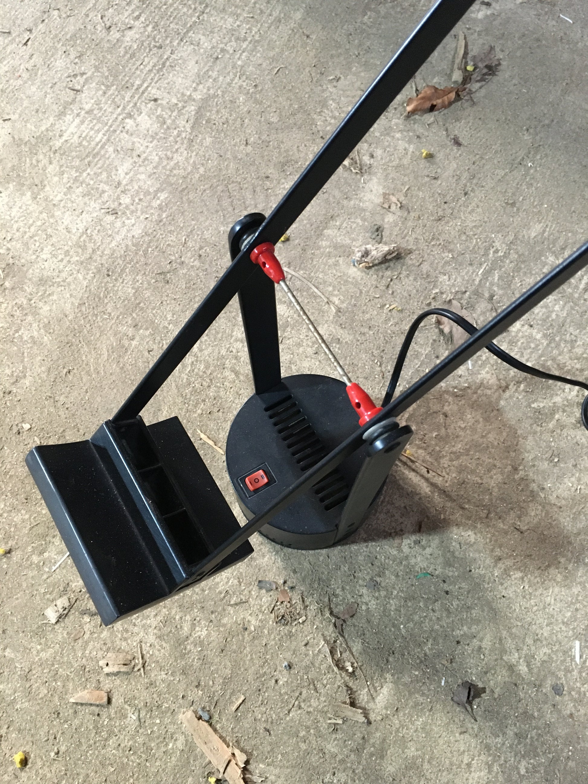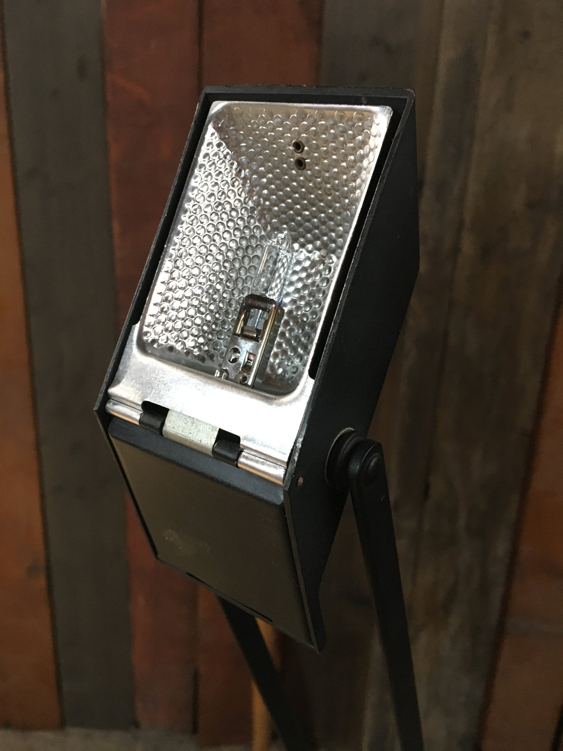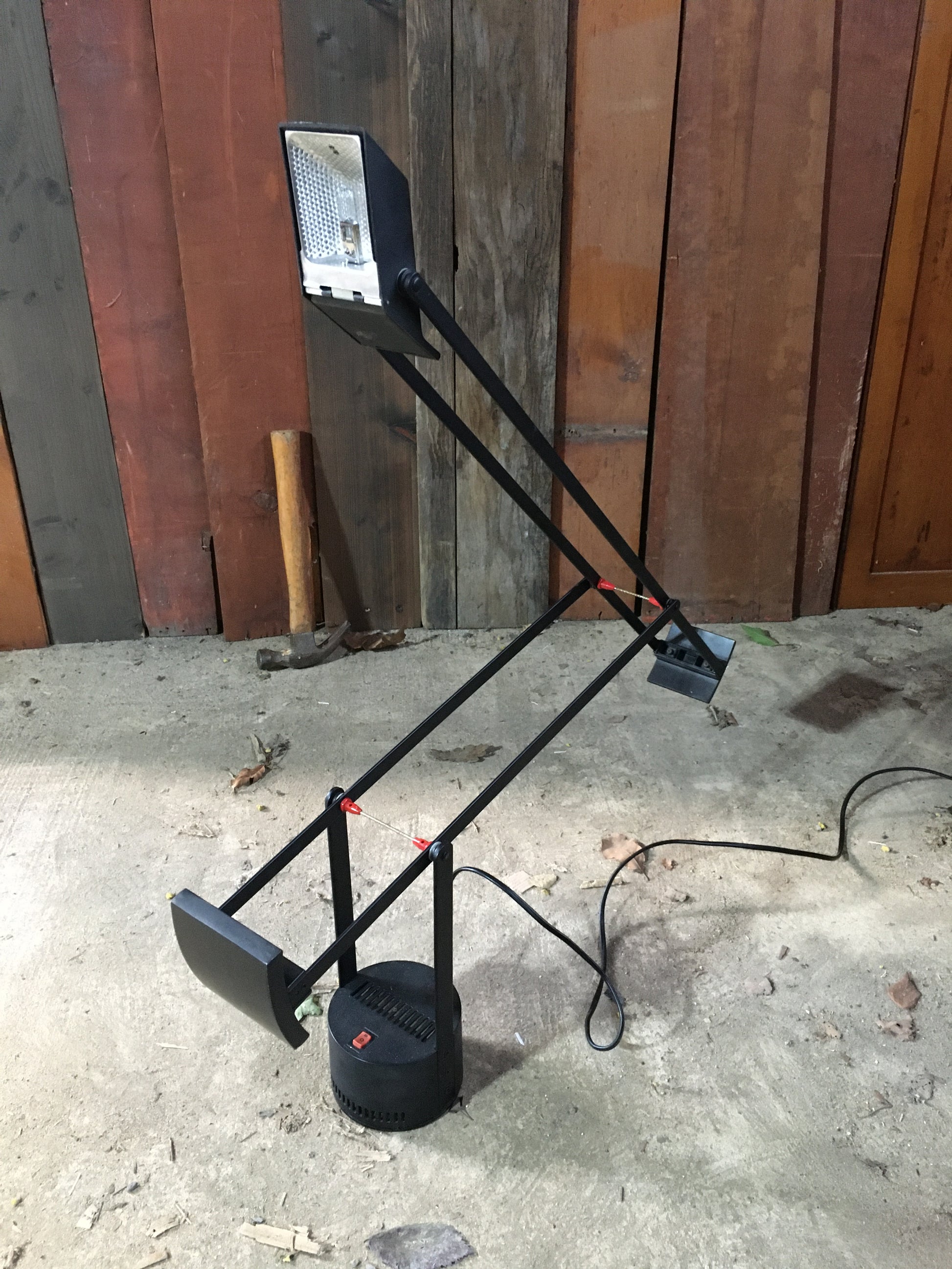 This example is one of the earliest and features a halogen bulb (like those used in cars), a switch with two different light intensities, it swivels smoothly and can be set in any position, and has no wires, as, thanks to the transformer in the base, the electricity is passed safely through the arms.